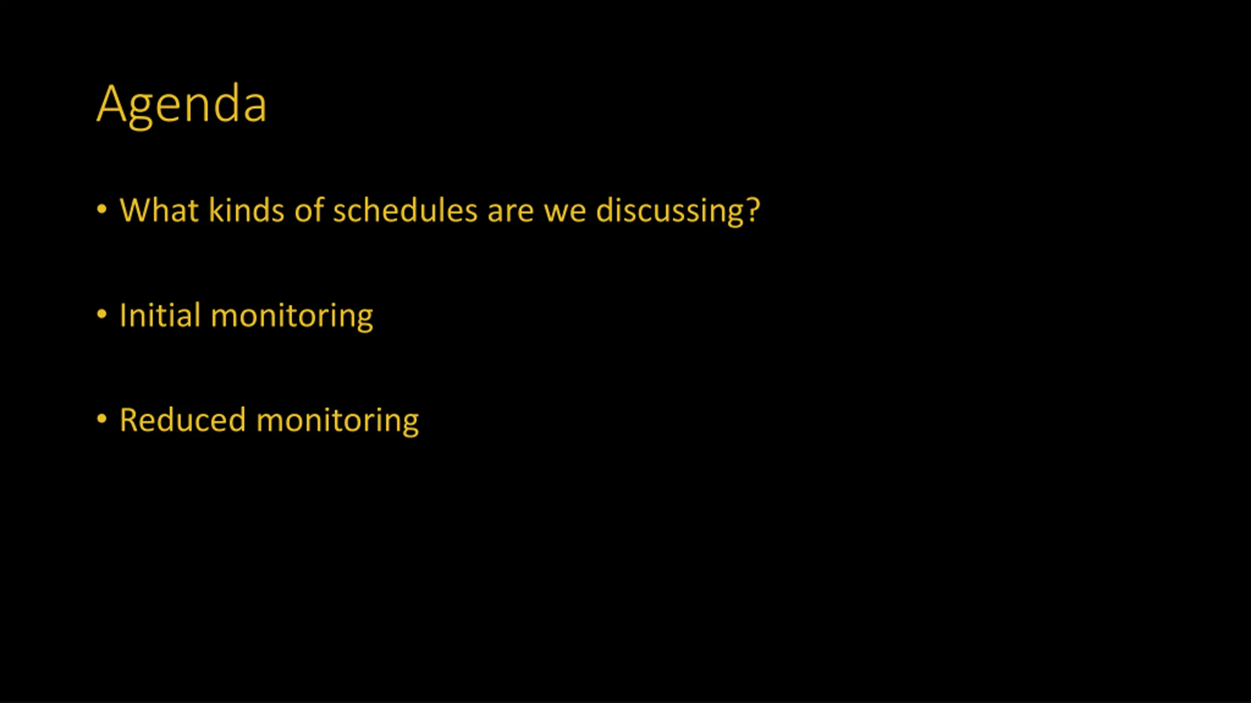 Agenda What kinds of schedules are we discussing? Initial monitoring Reduced monitoring