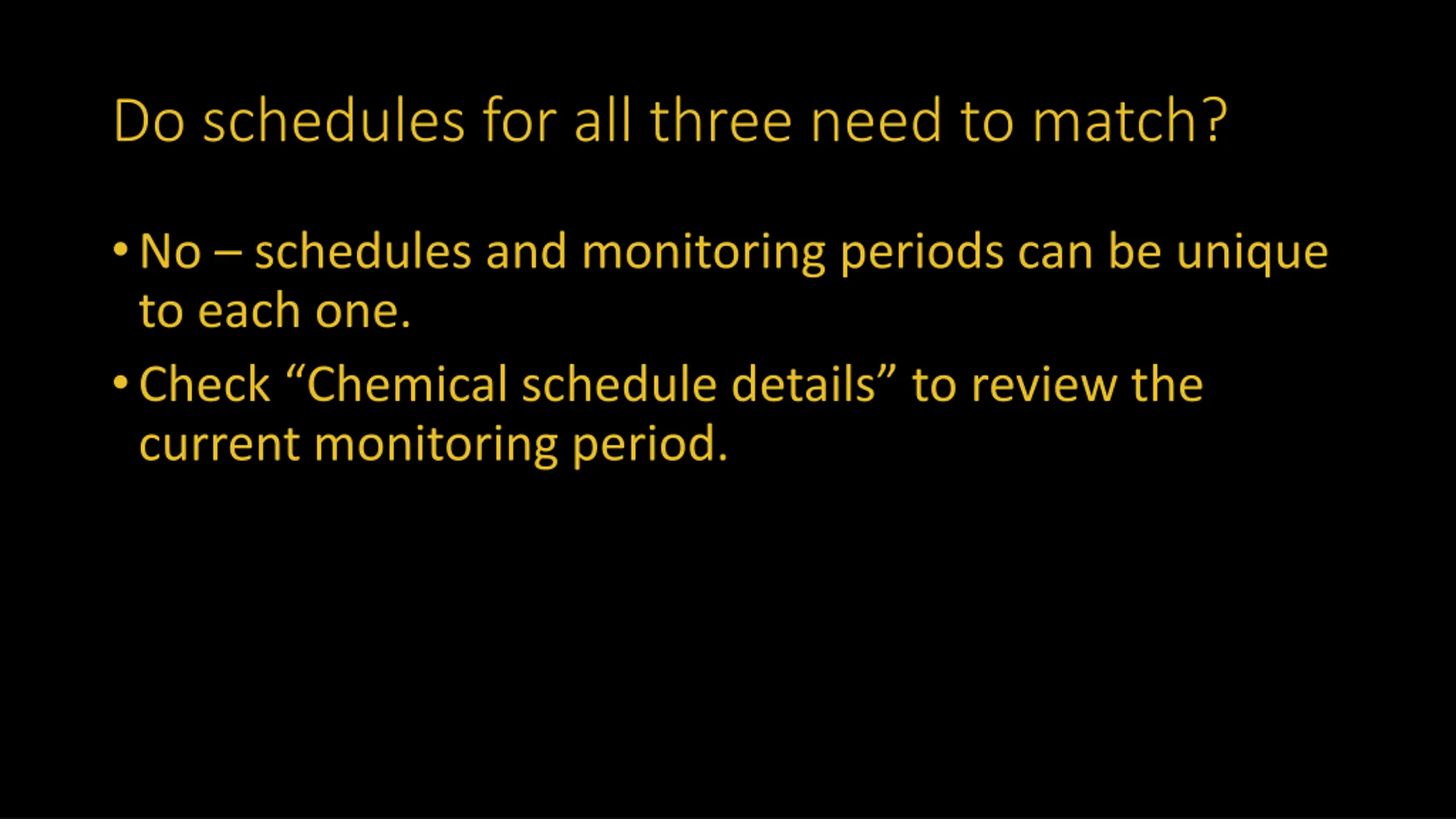 Do schedules for all three need to match? No schedules and monitoring periods can be unique to each one. Check Chemical schedule details to review the current monitoring period.