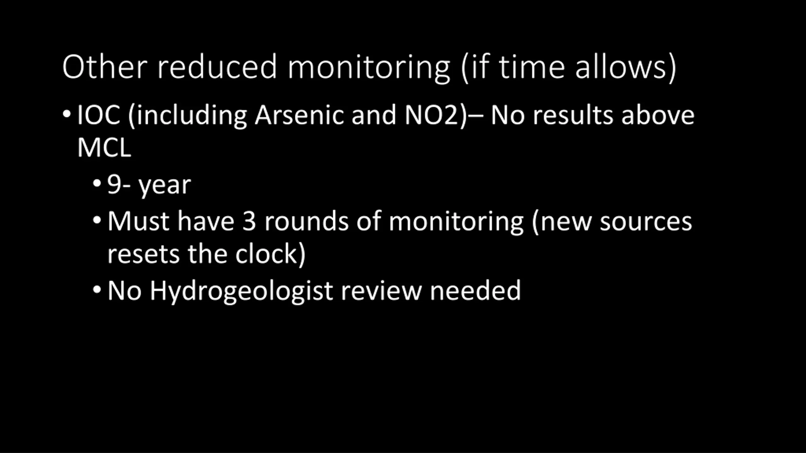 Other reduced monitoring (if time allows) IOC (including Arsenic and NO2) No results above MCL 9- year Must have 3 rounds of monitoring (new sources resets the clock) No Hydrogeologist review needed