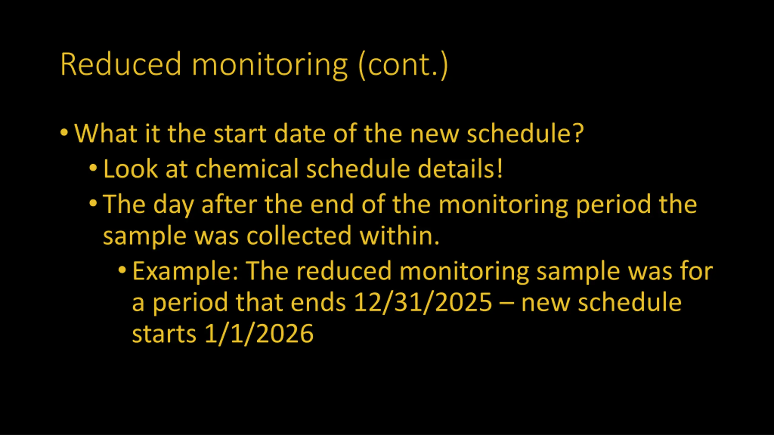 Reduced monitoring (cont.) What it the start date of the new schedule? Look at chemical schedule details! The day after the end of the monitoring period the sample was collected within. Example: The reduced monitoring sample was for a period that ends 12/31/2025 new schedule starts 1/1/2026