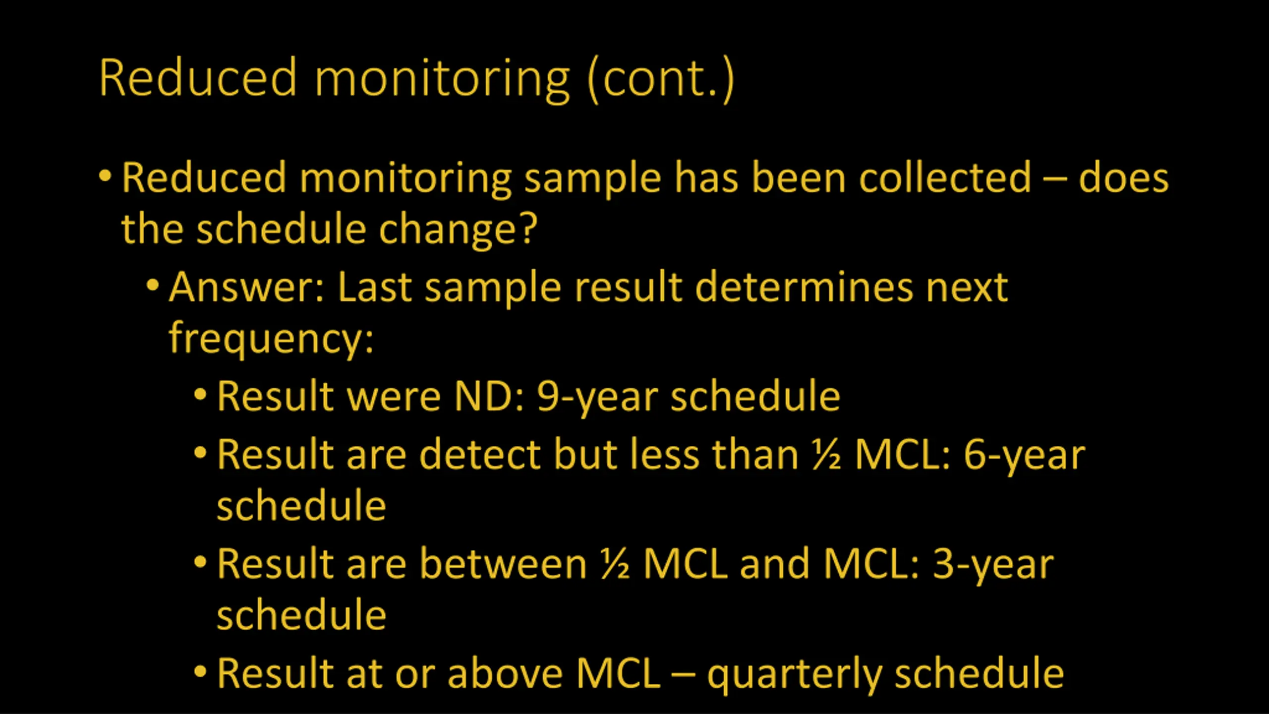 Reduced monitoring Initial monitoring is done now what schedule? Answer: depending on results of all initial monitoring samples: All results were ND: 9-year schedule Results are detected but less than MCL: 6-year schedule Results are between MCL and MCL: 3-year schedule At or above MCL stays on quarterly