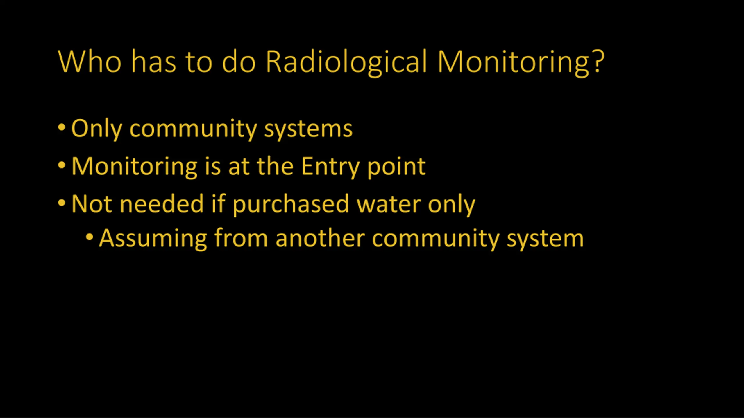 Who has to do Radiological Monitoring? Only community systems Monitoring is at the Entry point Not needed if purchased water only Assuming from another community system