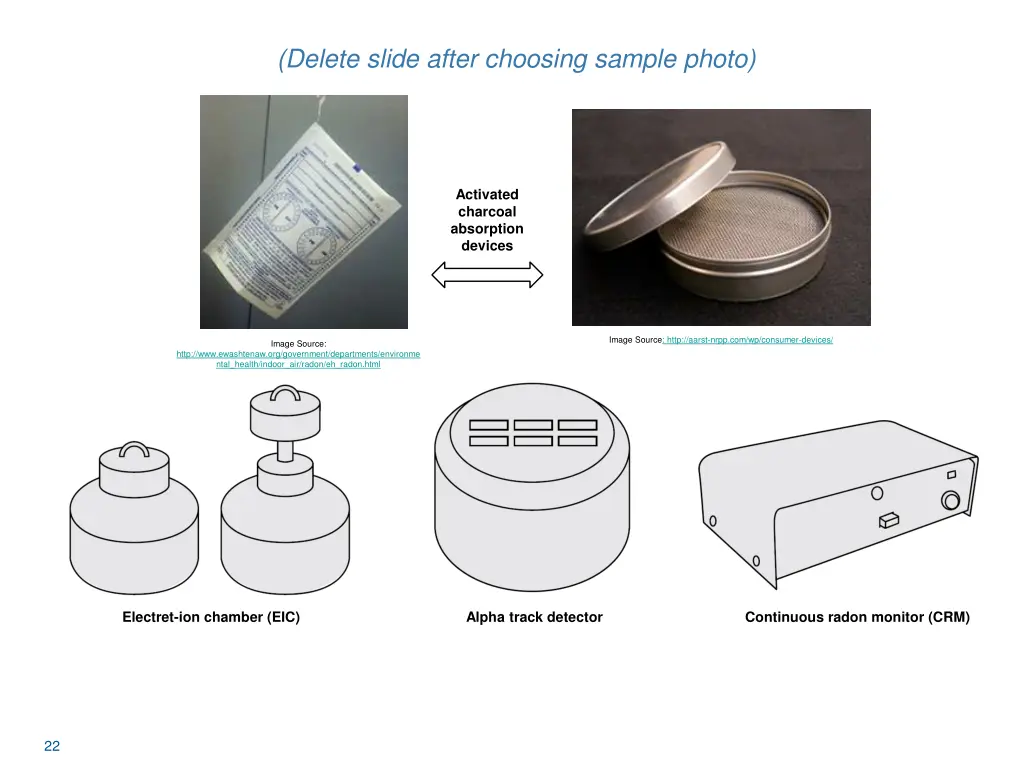 (Delete slide after choosing sample photo) Activated charcoal absorption devices Image Source: http://aarst-nrpp.com/wp/consumer-devices/ Image Source: http://www.ewashtenaw.org/government/departments/environme ntal_health/indoor_air/radon/eh_radon.html Electret-ion chamber (EIC) Alpha track detector Continuous radon monitor (CRM) 22