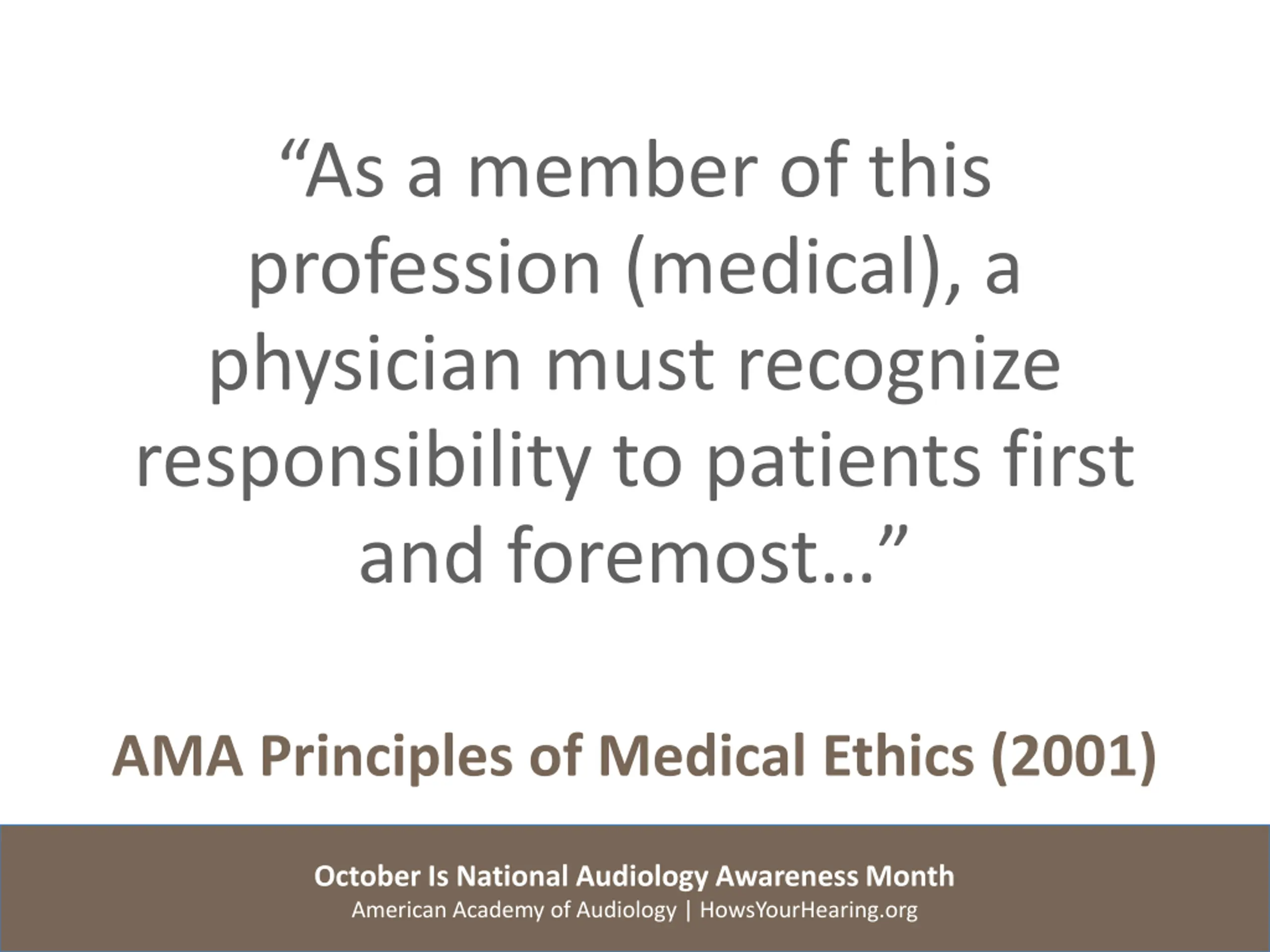 As a member of this profession (medical), a physician must recognize responsibility to patients first and foremost AMA Principles of Medical Ethics (2001) October Is National Audiology Awareness Month American Academy of Audiology | HowsYourHearing.org