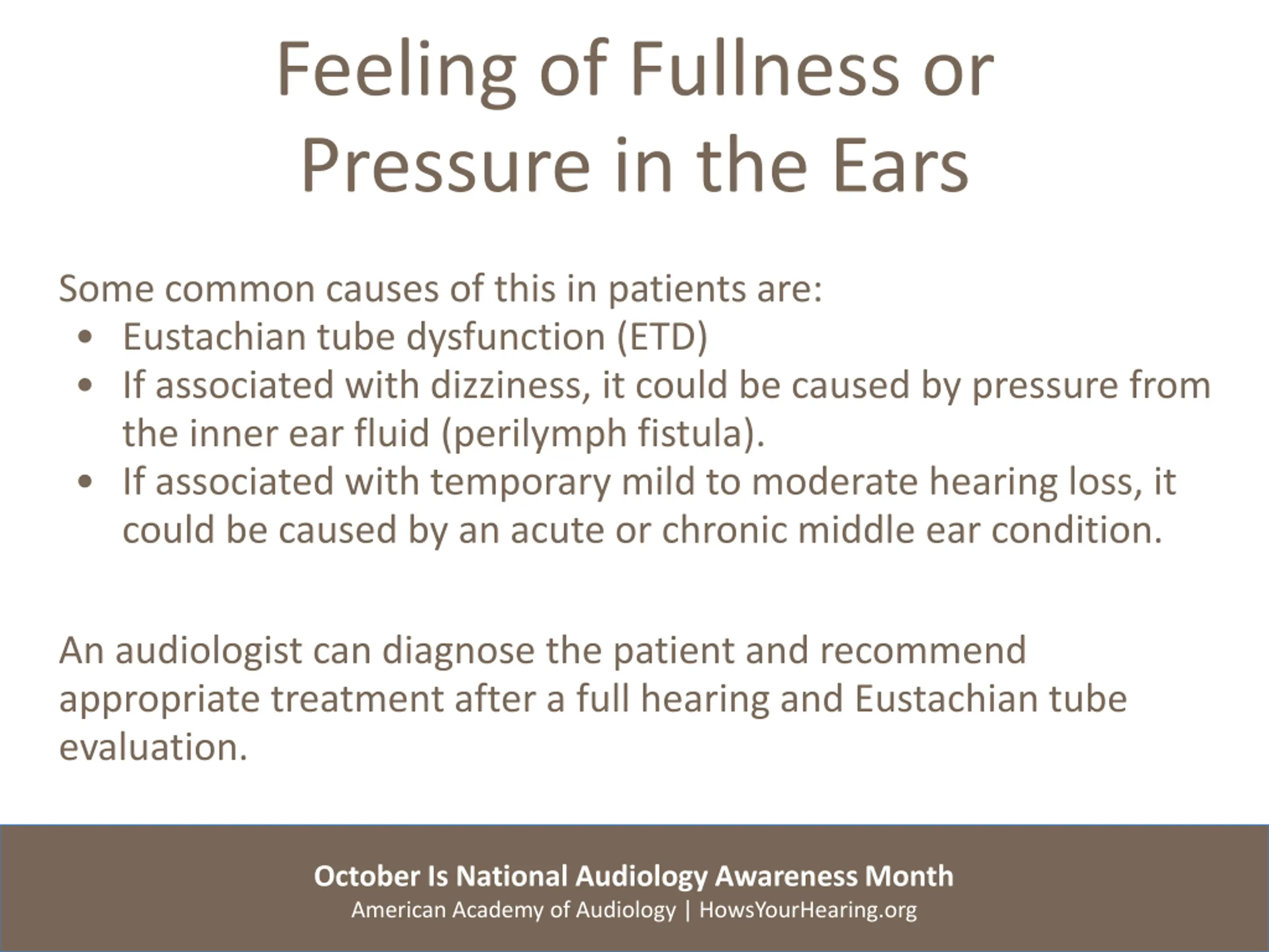 Feeling of Fullness or Pressure in the Ears Some common causes of this in patients are: Eustachian tube dysfunction (ETD) If associated with dizziness, it could be caused by pressure from the inner ear fluid (perilymph fistula). If associated with temporary mild to moderate hearing loss, it could be caused by an acute or chronic middle ear condition. An audiologist can diagnose the patient and recommend appropriate treatment after a full hearing and Eustachian tube evaluation. October Is National Audiology Awareness Month American Academy of Audiology | HowsYourHearing.org