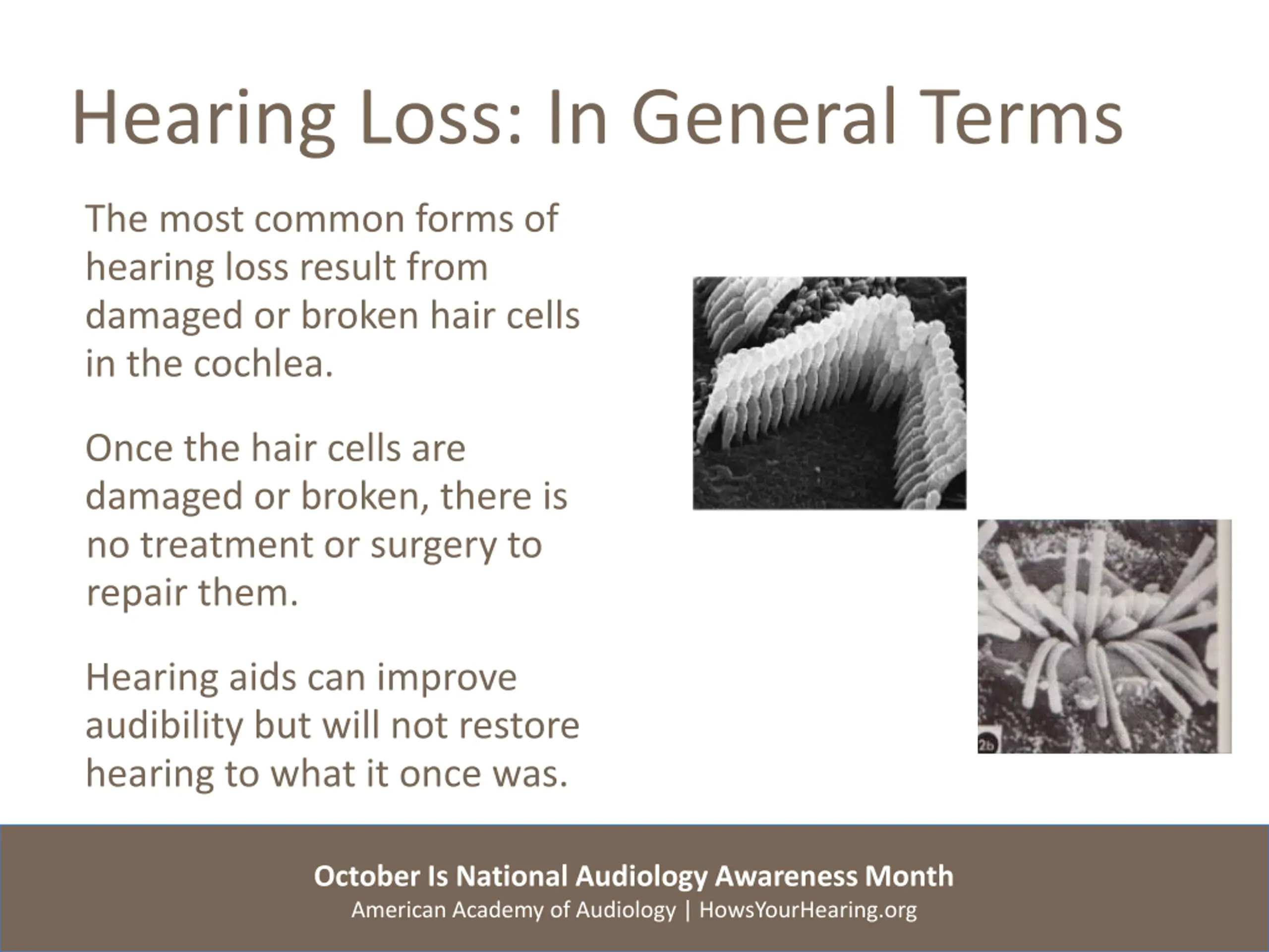 Hearing Loss: In General Terms The most common forms of hearing loss result from damaged or broken hair cells in the cochlea. Once the hair cells are damaged or broken, there is no treatment or surgery to repair them. Hearing aids can improve audibility but will not restore hearing to what it once was. October Is National Audiology Awareness Month American Academy of Audiology | HowsYourHearing.org