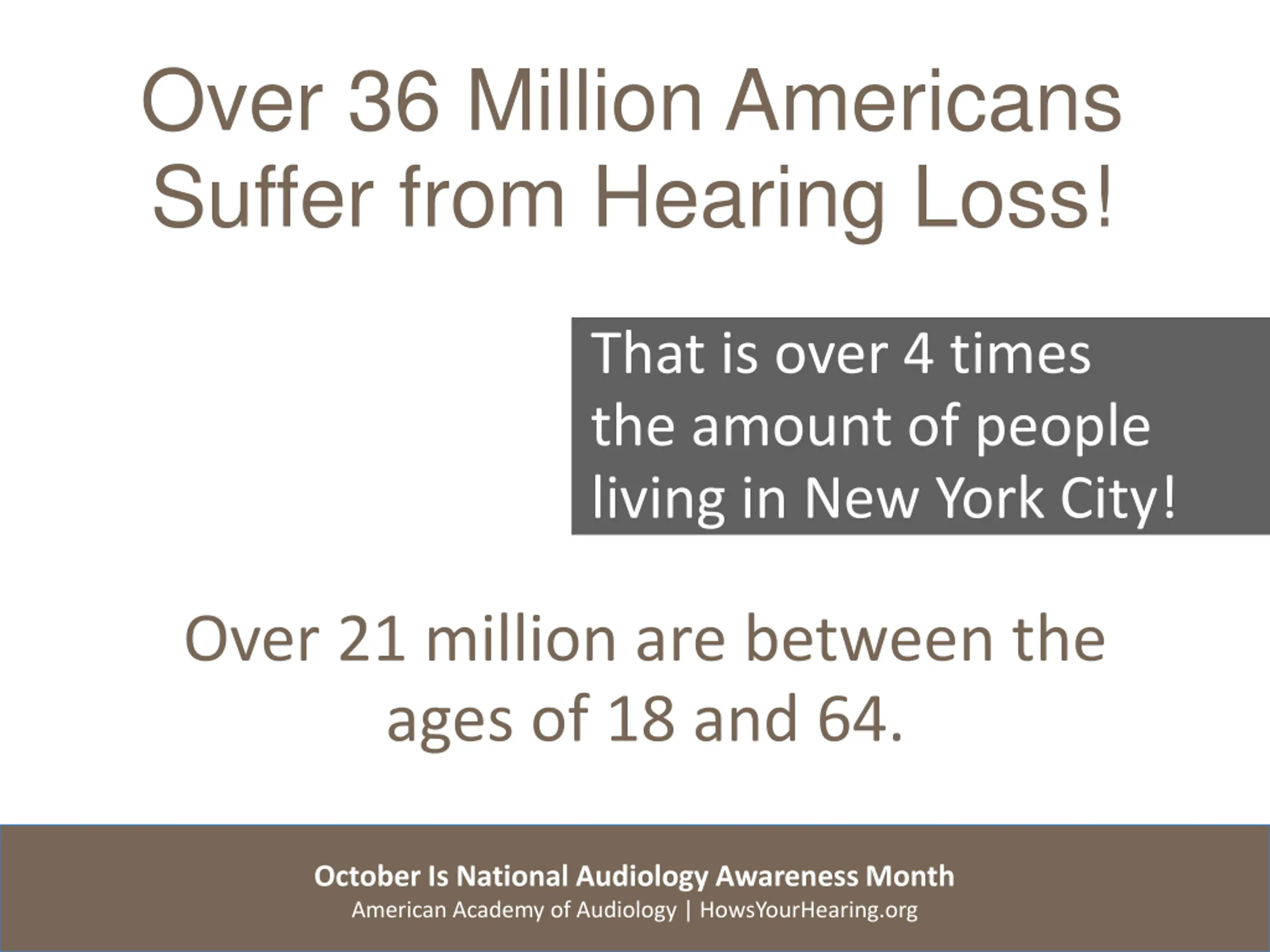 Over 36 Million Americans Suffer from Hearing Loss! That is over 4 times the amount of people living in New York City! Over 21 million are between the ages of 18 and 64. October Is National Audiology Awareness Month American Academy of Audiology | HowsYourHearing.org