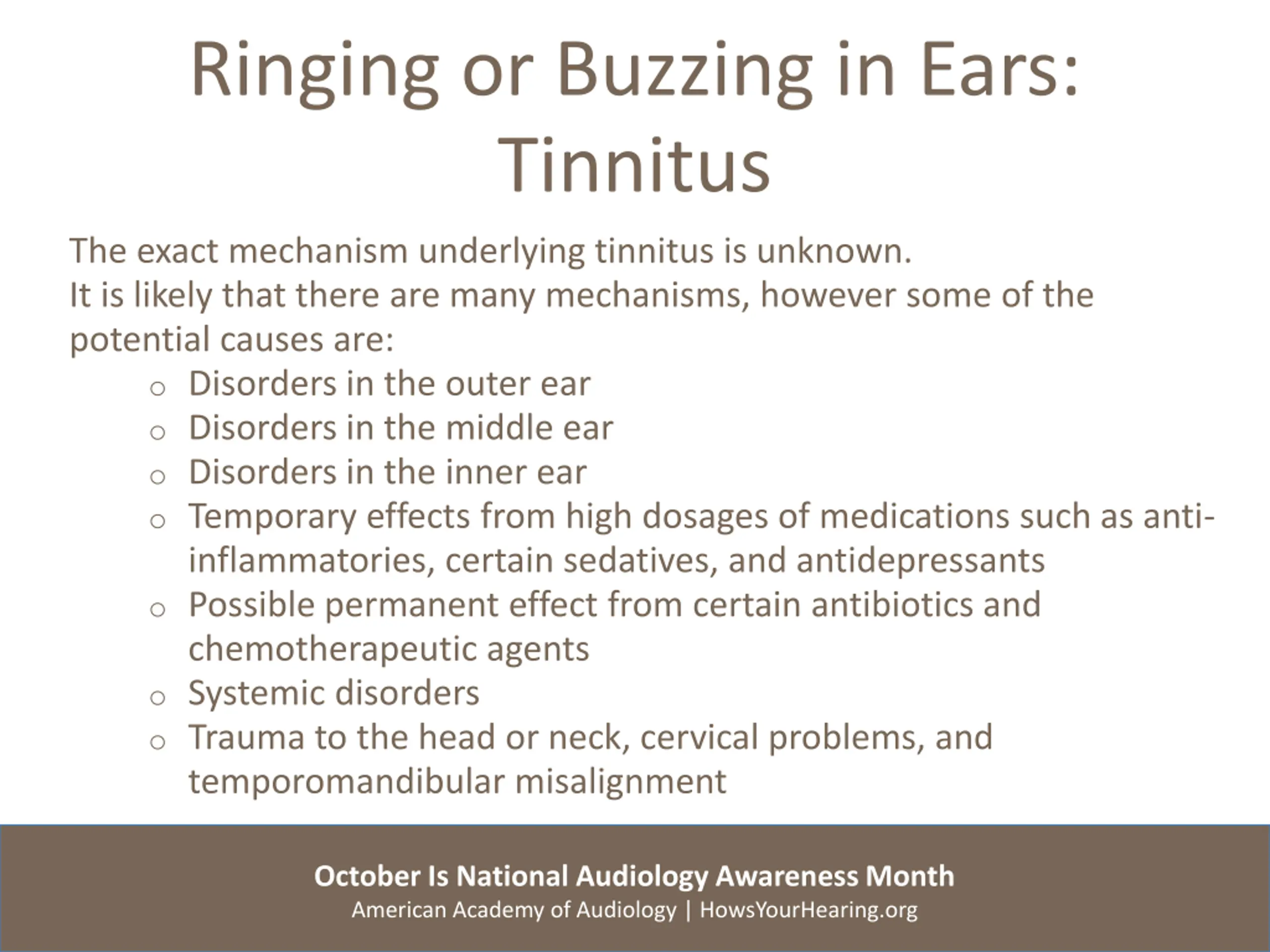 Ringing or Buzzing in Ears: Tinnitus The exact mechanism underlying tinnitus is unknown. It is likely that there are many mechanisms, however some of the potential causes are: o Disorders in the outer ear o Disorders in the middle ear o Disorders in the inner ear o Temporary effects from high dosages of medications such as anti- inflammatories, certain sedatives, and antidepressants o Possible permanent effect from certain antibiotics and chemotherapeutic agents o Systemic disorders o Trauma to the head or neck, cervical problems, and temporomandibular misalignment October Is National Audiology Awareness Month American Academy of Audiology | HowsYourHearing.org