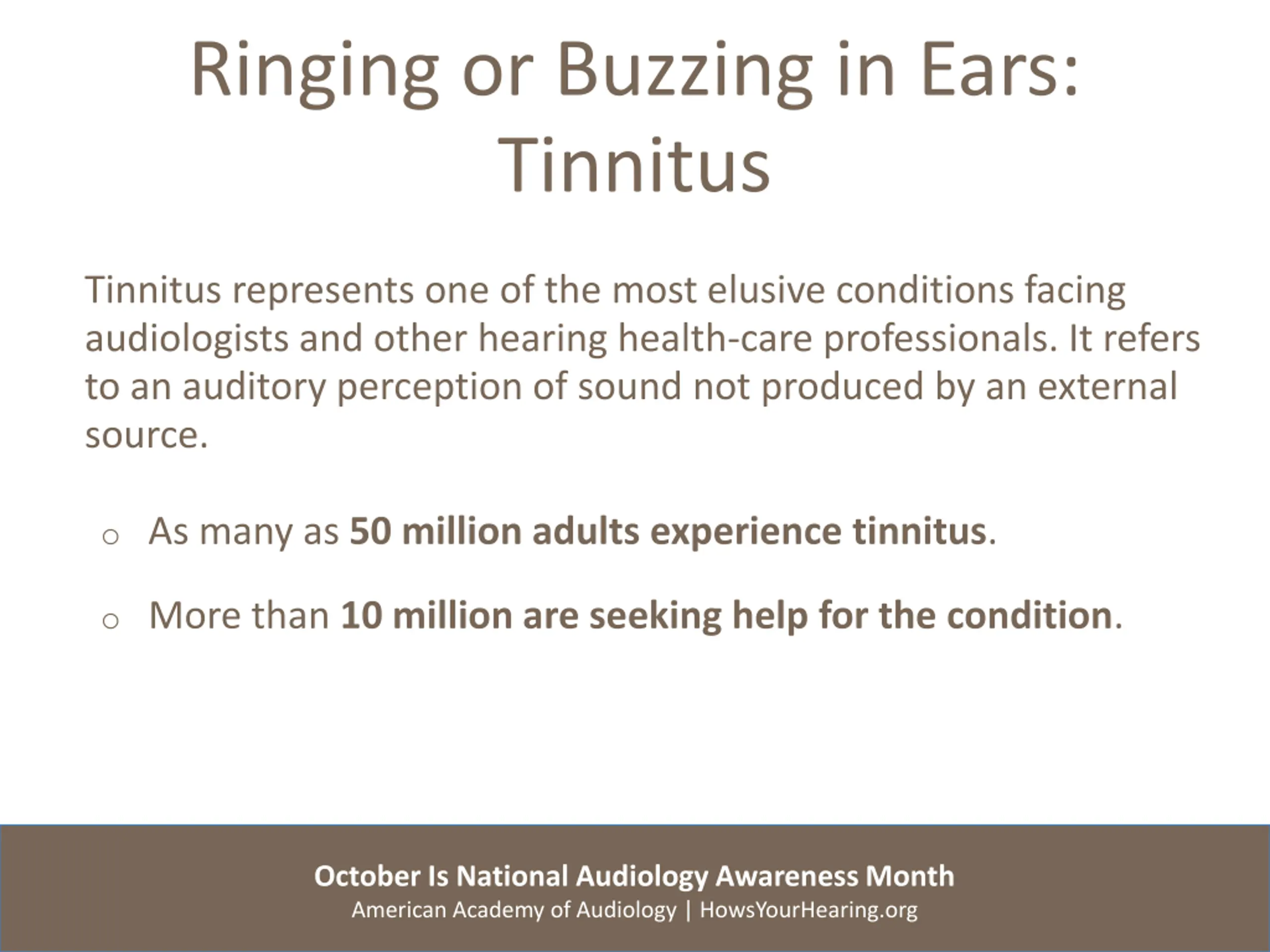 Ringing or Buzzing in Ears: Tinnitus Tinnitus represents one of the most elusive conditions facing audiologists and other hearing health-care professionals. It refers to an auditory perception of sound not produced by an external source. o As many as 50 million adults experience tinnitus. o More than 10 million are seeking help for the condition. October Is National Audiology Awareness Month American Academy of Audiology | HowsYourHearing.org