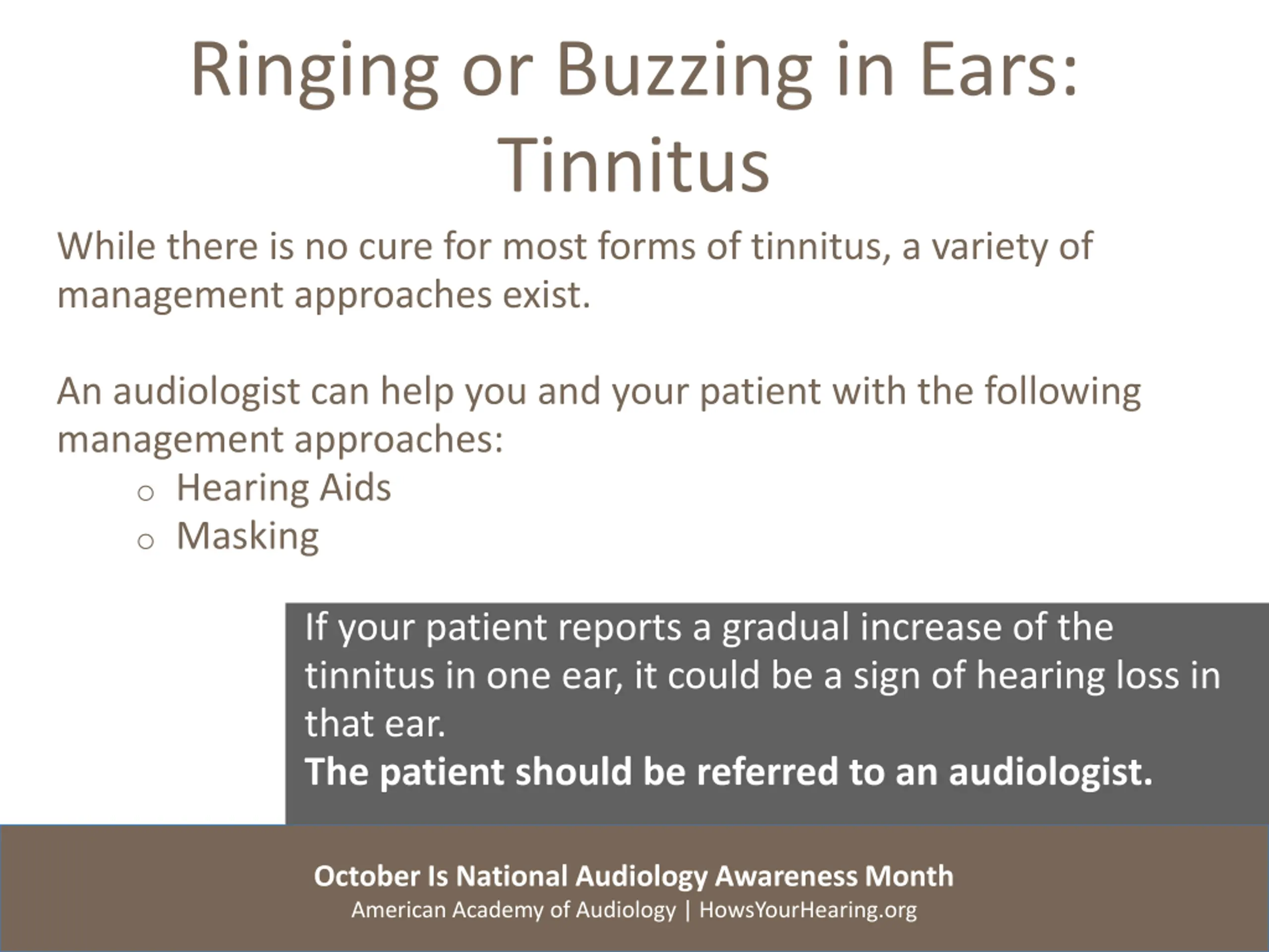 Ringing or Buzzing in Ears: Tinnitus While there is no cure for most forms of tinnitus, a variety of management approaches exist. An audiologist can help you and your patient with the following management approaches: o Hearing Aids o Masking If your patient reports a gradual increase of the tinnitus in one ear, it could be a sign of hearing loss in that ear. The patient should be referred to an audiologist. October Is National Audiology Awareness Month American Academy of Audiology | HowsYourHearing.org