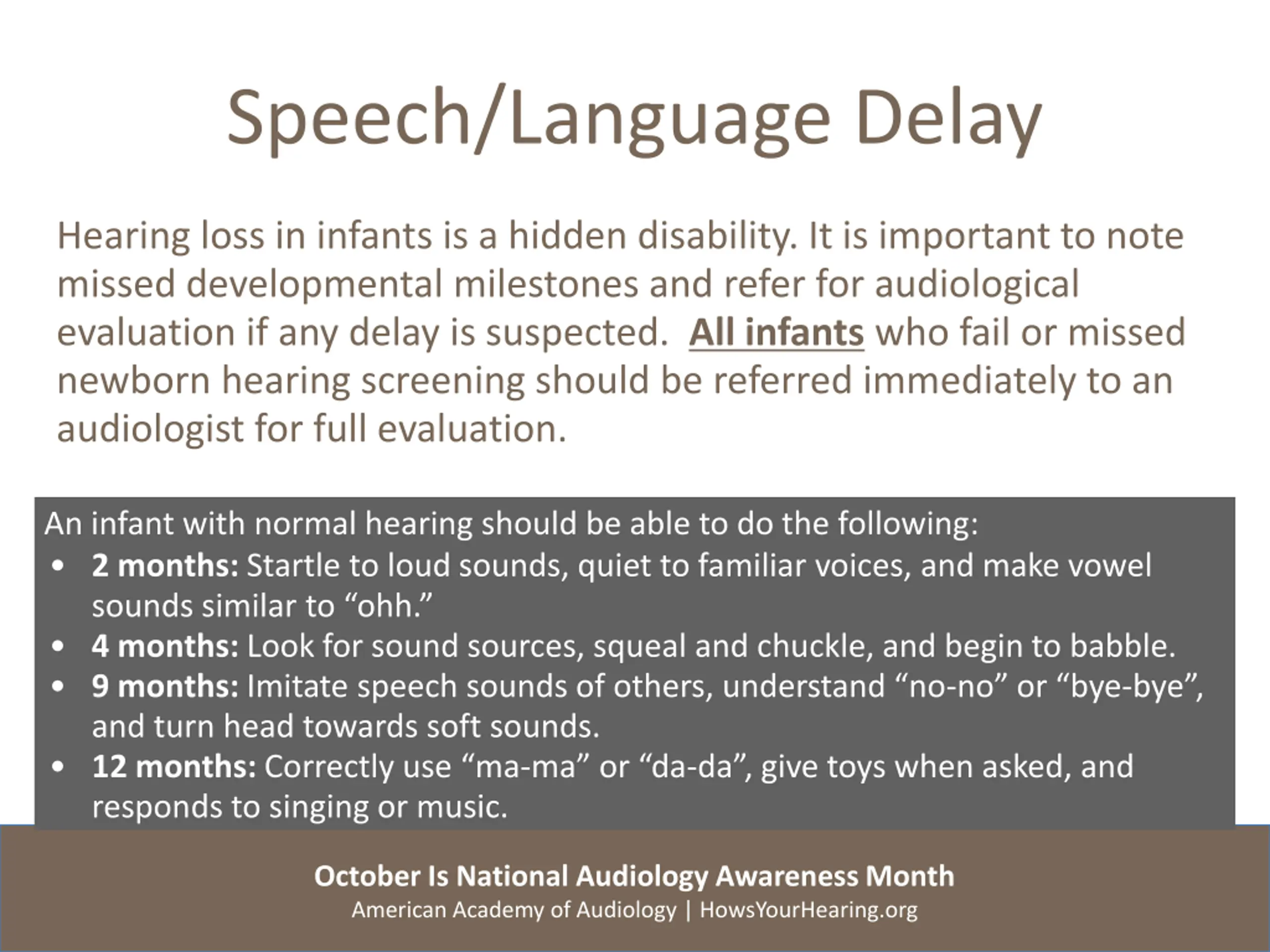 Speech/Language Delay Hearing loss in infants is a hidden disability. It is important to note missed developmental milestones and refer for audiological evaluation if any delay is suspected. All infants who fail or missed newborn hearing screening should be referred immediately to an audiologist for full evaluation. An infant with normal hearing should be able to do the following: 2 months: Startle to loud sounds, quiet to familiar voices, and make vowel sounds similar to ohh. 4 months: Look for sound sources, squeal and chuckle, and begin to babble. 9 months: Imitate speech sounds of others, understand no-no or bye-bye , and turn head towards soft sounds. 12months:Correctly use ma-ma or da-da , give toys when asked, and responds to singing or music. October Is National Audiology Awareness Month American Academy of Audiology | HowsYourHearing.org