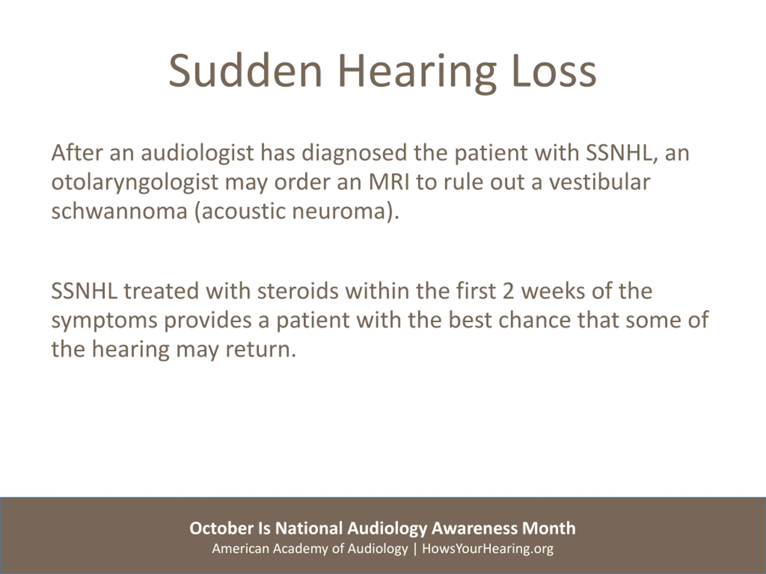 Sudden Hearing Loss After an audiologist has diagnosed the patient with SSNHL, an otolaryngologist may order an MRI to rule out a vestibular schwannoma (acoustic neuroma). SSNHL treated with steroids within the first 2 weeks of the symptoms provides a patient with the best chance that some of the hearing may return. October Is National Audiology Awareness Month American Academy of Audiology | HowsYourHearing.org