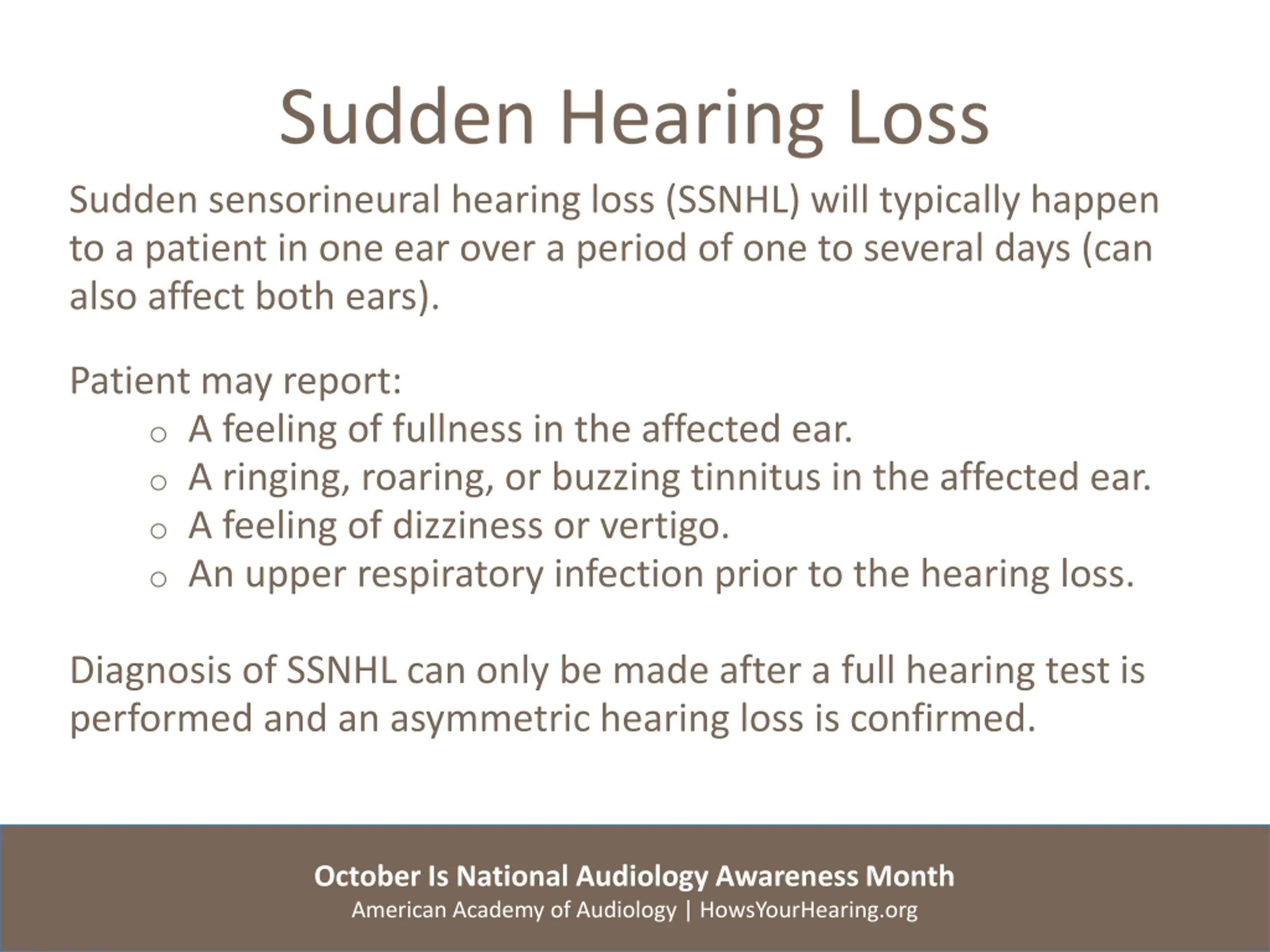 Sudden Hearing Loss Sudden sensorineural hearing loss (SSNHL) will typically happen to a patient in one ear over a period of one to several days (can also affect both ears). Patient may report: o A feeling of fullness in the affected ear. o A ringing, roaring, or buzzing tinnitus in the affected ear. o A feeling of dizziness or vertigo. o An upper respiratory infection prior to the hearing loss. Diagnosis of SSNHL can only be made after a full hearing test is performed and an asymmetric hearing loss is confirmed. October Is National Audiology Awareness Month American Academy of Audiology | HowsYourHearing.org