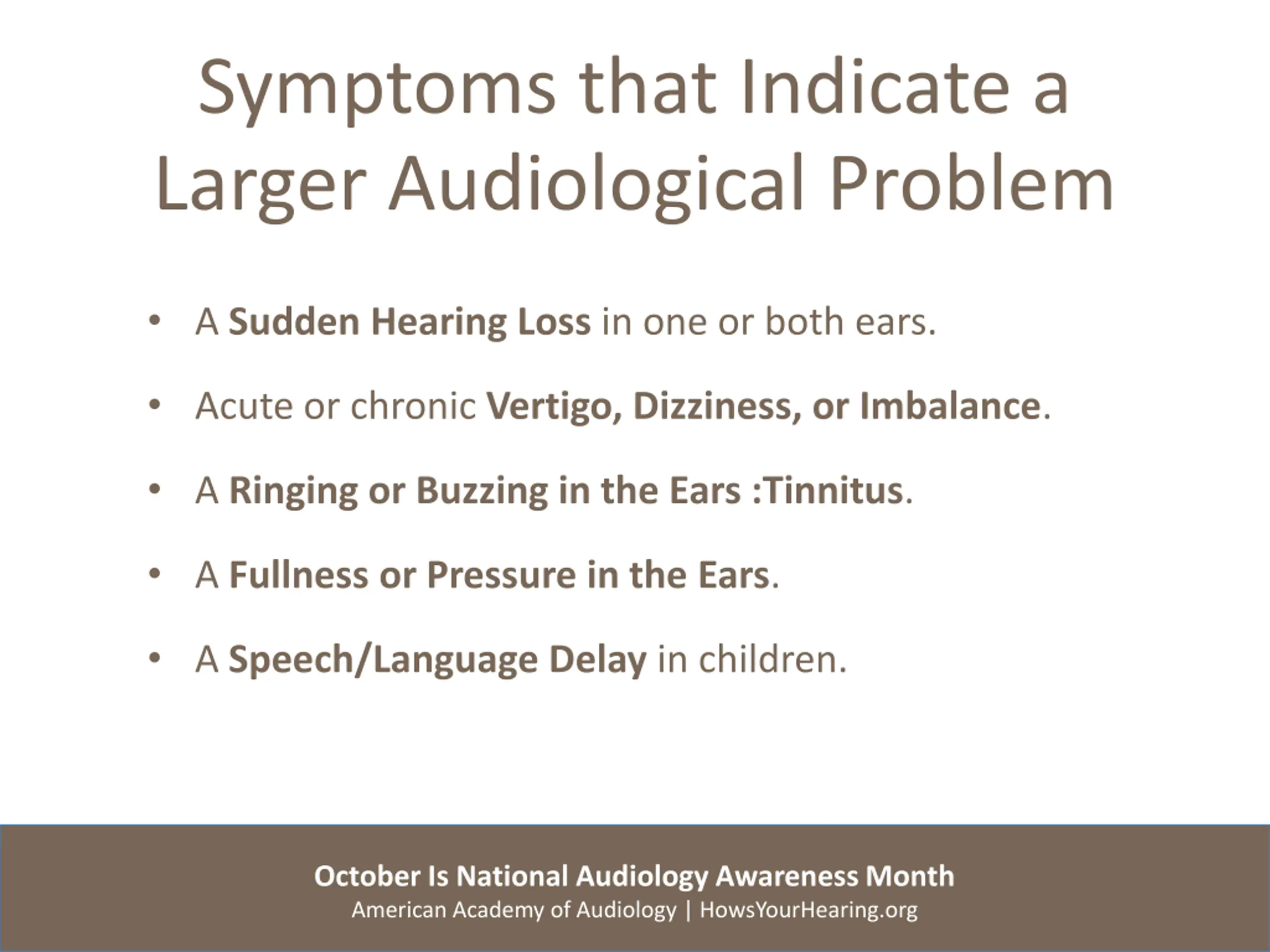 Symptoms that Indicate a Larger Audiological Problem A Sudden Hearing Loss in one or both ears. Acute or chronic Vertigo, Dizziness, or Imbalance. A Ringing or Buzzing in the Ears :Tinnitus. A Fullness or Pressure in the Ears. A Speech/Language Delay in children. October Is National Audiology Awareness Month American Academy of Audiology | HowsYourHearing.org