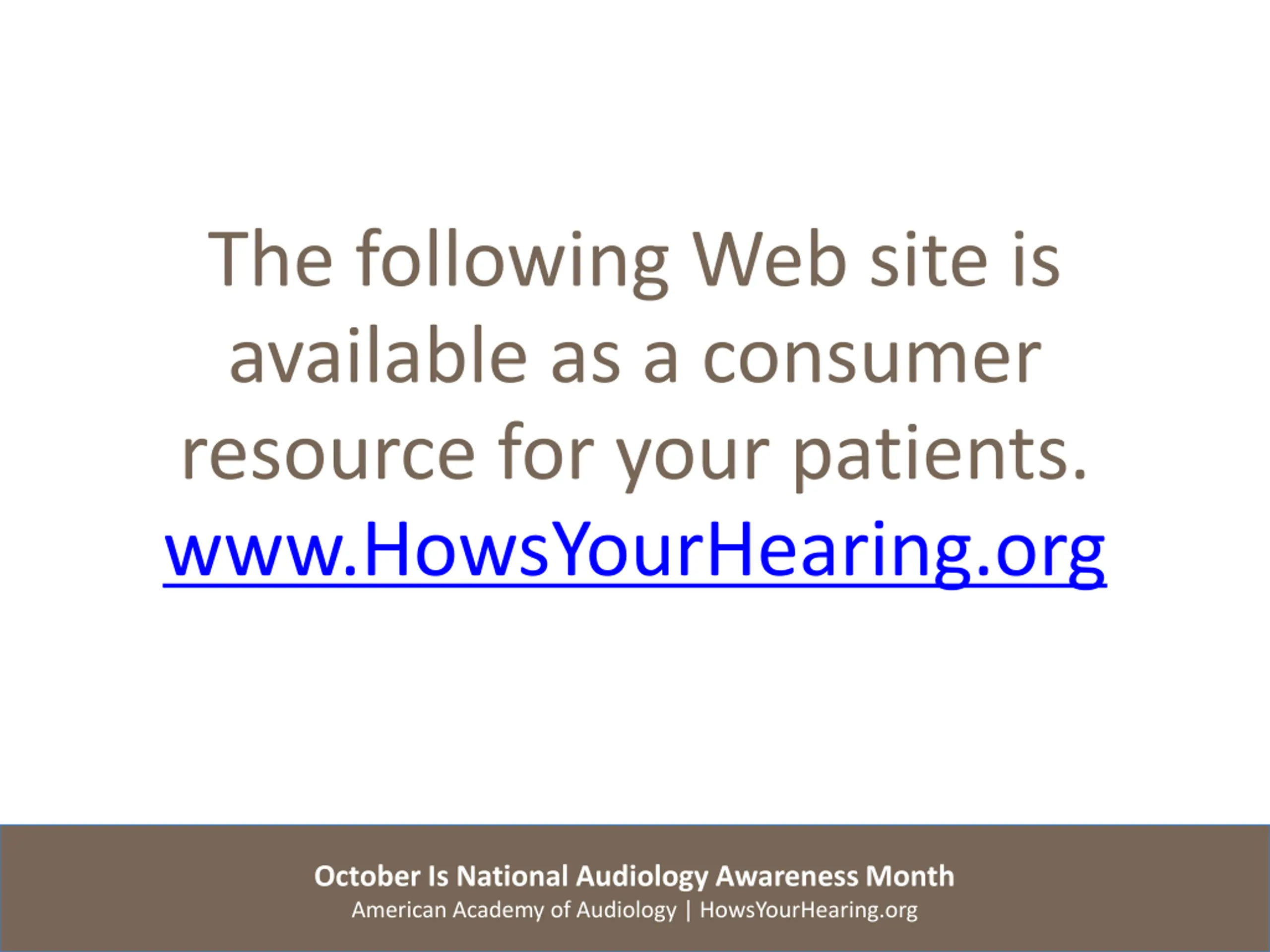 The following Web site is available as a consumer resource for your patients. www.HowsYourHearing.org October Is National Audiology Awareness Month American Academy of Audiology | HowsYourHearing.org
