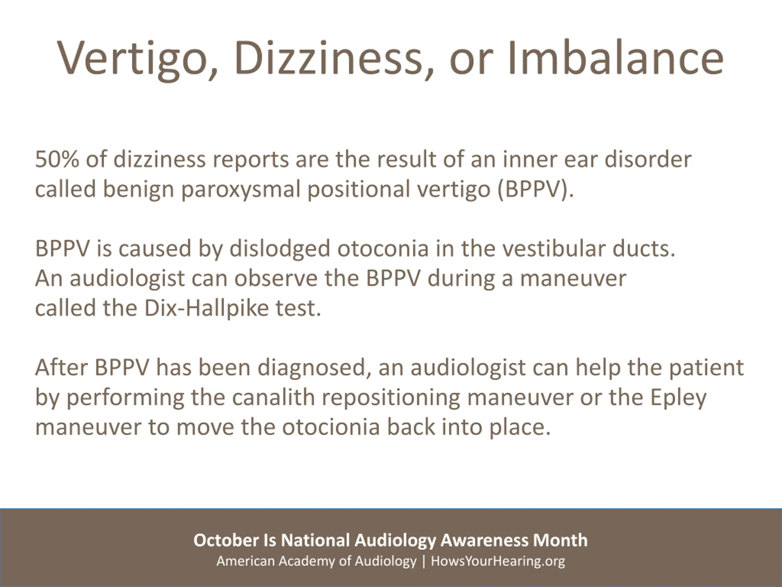 Vertigo, Dizziness, or Imbalance 50% of dizziness reports are the result of an inner ear disorder called benign paroxysmal positional vertigo (BPPV). BPPV is caused by dislodged otoconia in the vestibular ducts. An audiologist can observe the BPPV during a maneuver called the Dix-Hallpike test. After BPPV has been diagnosed, an audiologist can help the patient by performing the canalith repositioning maneuver or the Epley maneuver to move the otocionia back into place. October Is National Audiology Awareness Month American Academy of Audiology | HowsYourHearing.org
