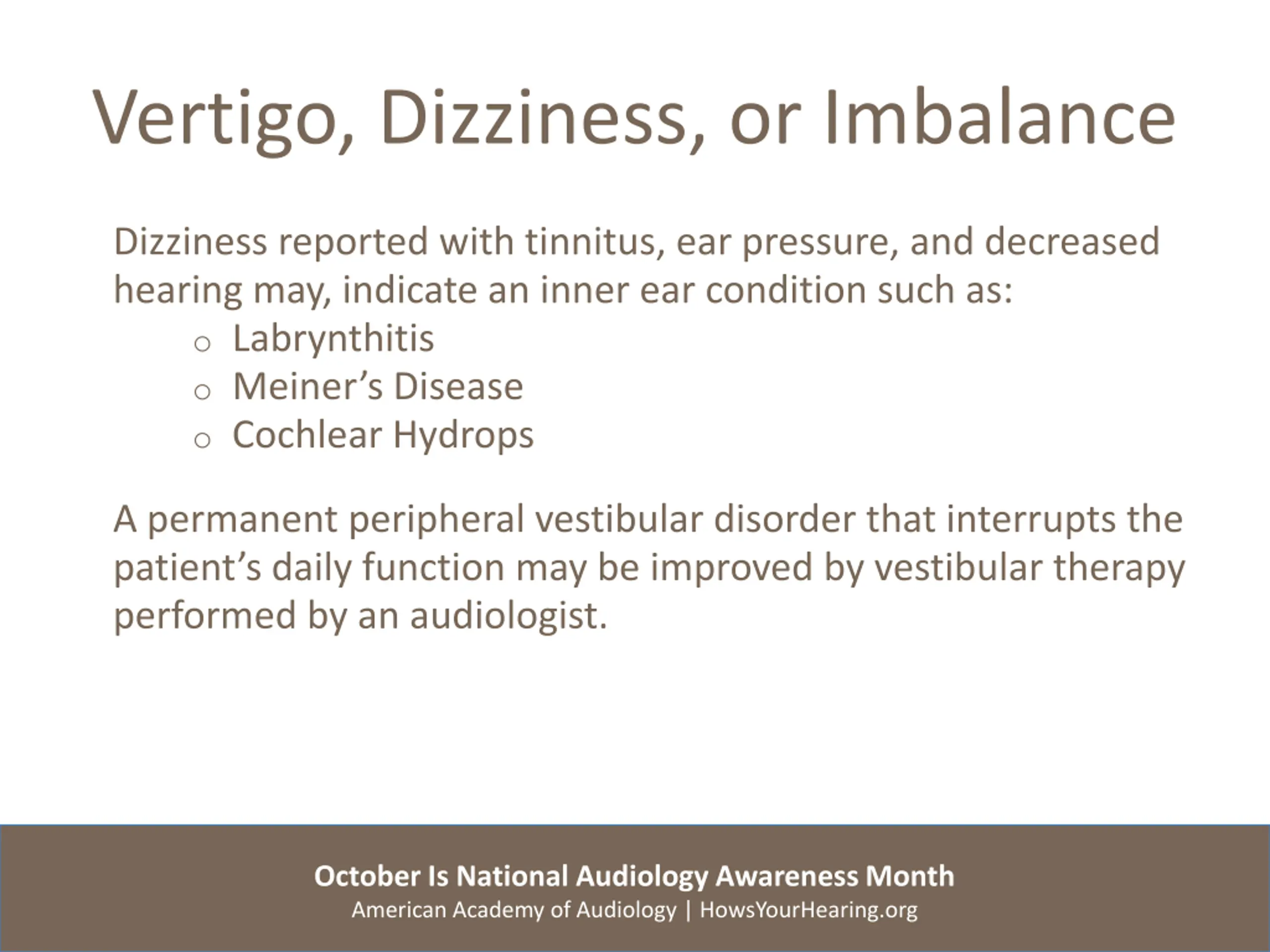 Vertigo, Dizziness, or Imbalance Dizziness reported with tinnitus, ear pressure, and decreased hearing may, indicate an inner ear condition such as: o Labrynthitis o Meiner s Disease o Cochlear Hydrops A permanent peripheral vestibular disorder that interrupts the patient s daily function may be improved by vestibular therapy performed by an audiologist. October Is National Audiology Awareness Month American Academy of Audiology | HowsYourHearing.org