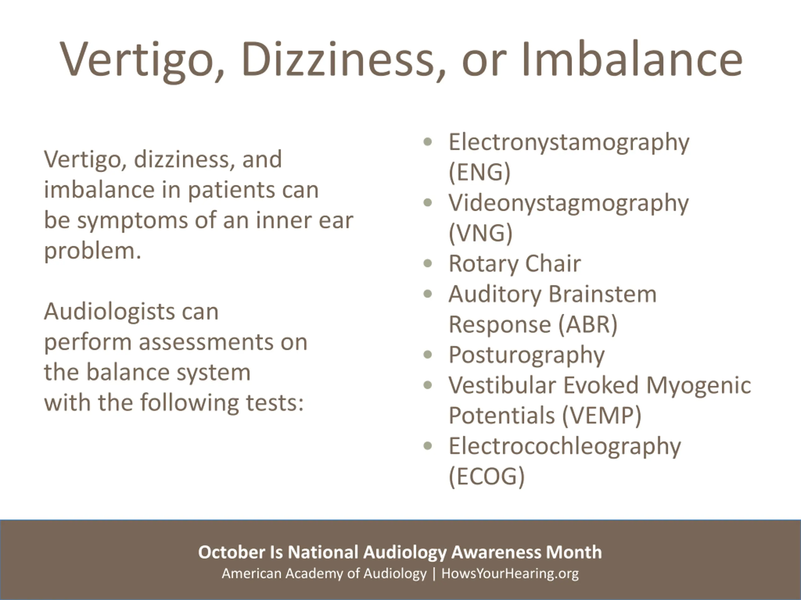 Vertigo, Dizziness, or Imbalance Electronystamography (ENG) Videonystagmography (VNG) Rotary Chair Auditory Brainstem Response (ABR) Posturography Vestibular Evoked Myogenic Potentials (VEMP) Electrocochleography (ECOG) Vertigo, dizziness, and imbalance in patients can be symptoms of an inner ear problem. Audiologists can perform assessments on the balance system with the following tests: October Is National Audiology Awareness Month American Academy of Audiology | HowsYourHearing.org