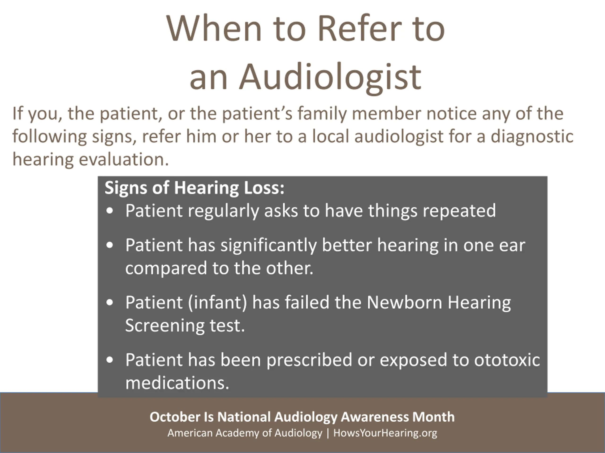 When to Refer to an Audiologist If you, the patient, or the patient s family member notice any of the following signs, refer him or her to a local audiologist for a diagnostic hearing evaluation. Signs of Hearing Loss: Patient regularly asks to have things repeated Patient has significantly better hearing in one ear compared to the other. Patient (infant) has failed the Newborn Hearing Screening test. Patient has been prescribed or exposed to ototoxic medications. October Is National Audiology Awareness Month American Academy of Audiology | HowsYourHearing.org