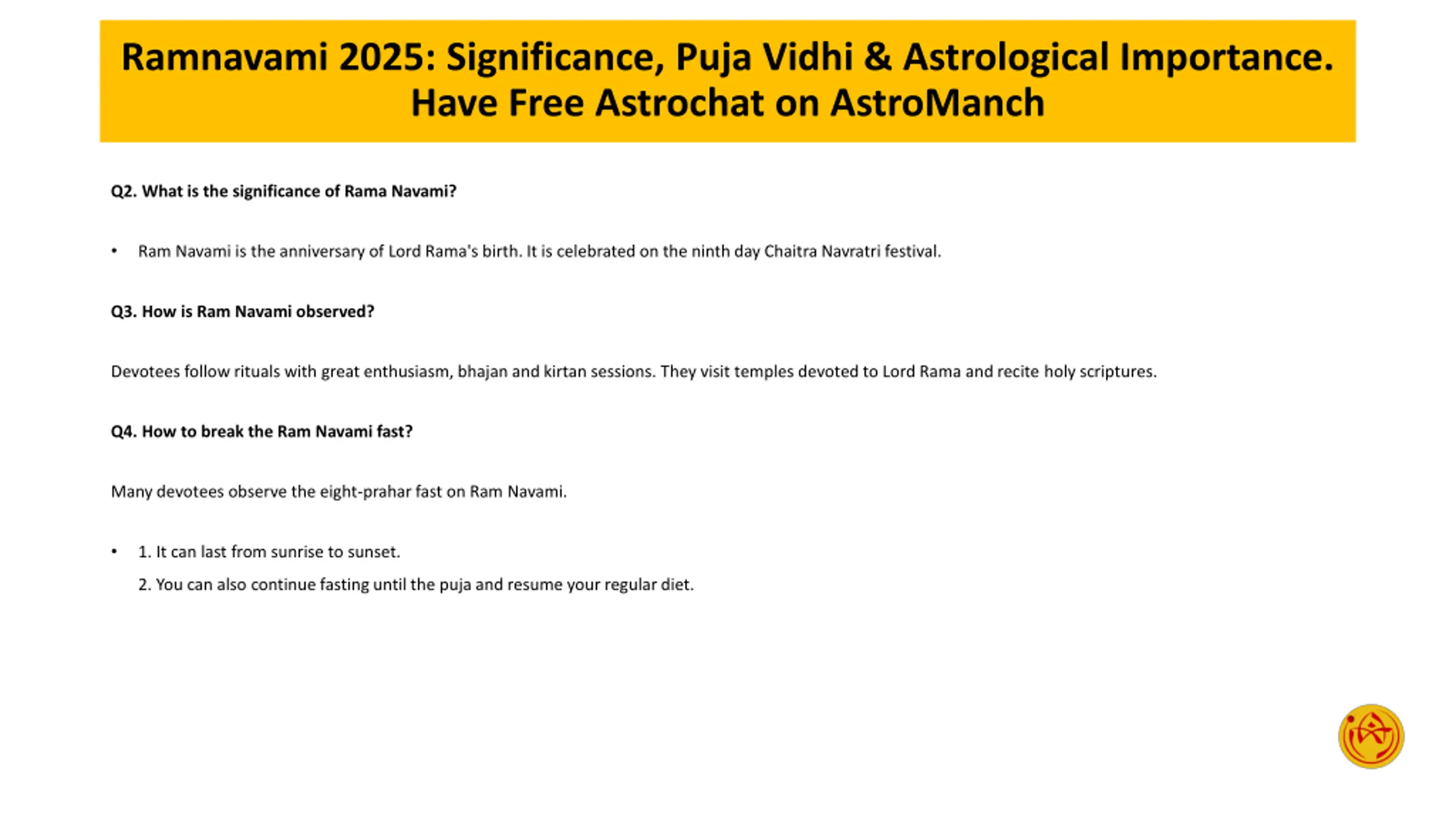 Ramnavami 2025: Significance, Puja Vidhi & Astrological Importance. Have Free Astrochat on AstroManch Q2. What is the significance of Rama Navami? Ram Navami is the anniversary of Lord Rama's birth. It is celebrated on the ninth day Chaitra Navratri festival. Q3. How is Ram Navami observed? Devotees follow rituals with great enthusiasm, bhajan and kirtan sessions. They visit temples devoted to Lord Rama and recite holy scriptures. Q4. How to break the Ram Navami fast? Many devotees observe the eight-praharfast on Ram Navami. 1. It can last from sunrise to sunset. 2. You can also continue fasting until the puja and resume your regular diet.