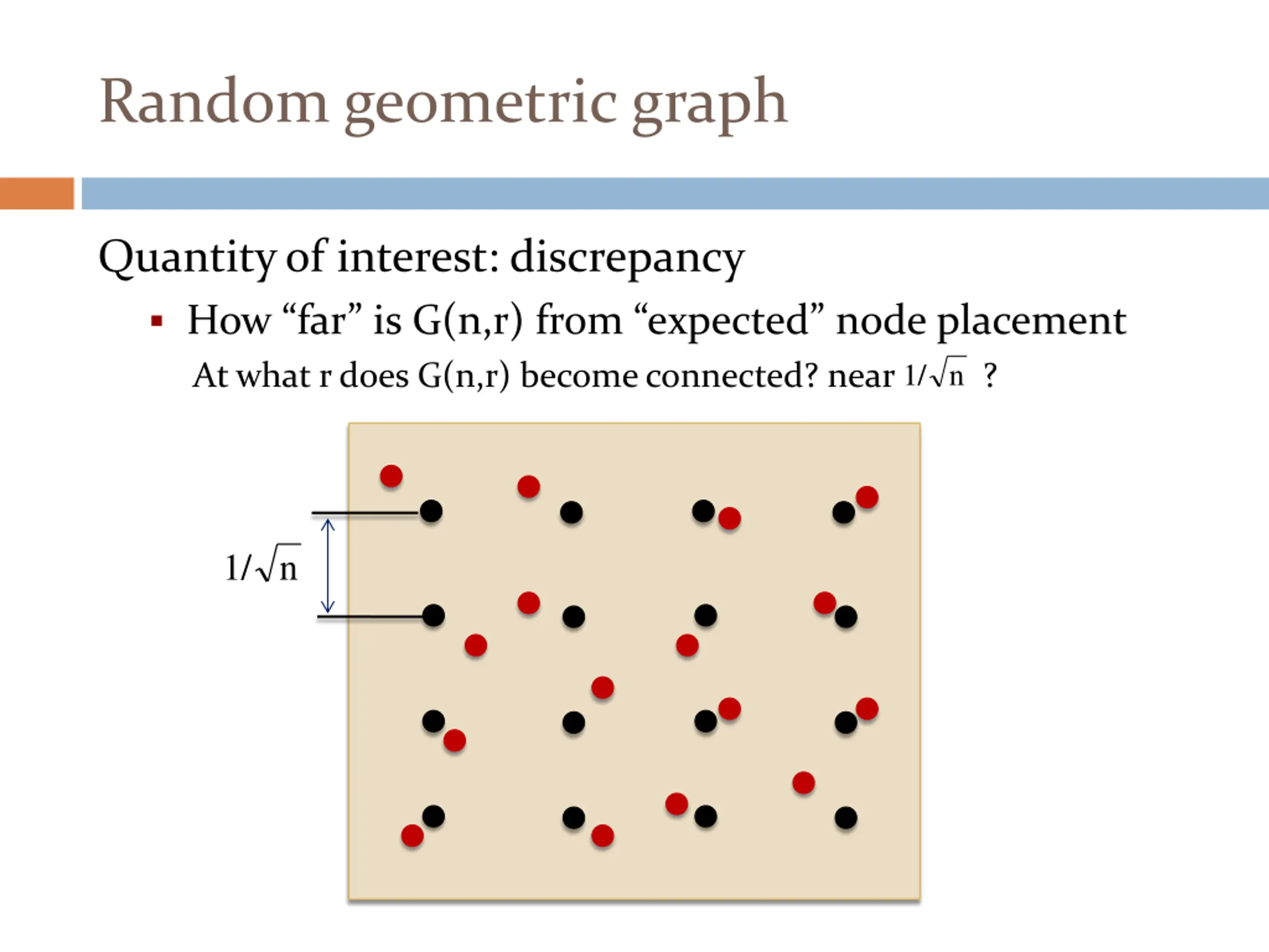 Random geometric graph Quantity of interest: discrepancy How far is G(n,r) from expected node placement At what r does G(n,r) become connected? near ? 1/ n 1/ n