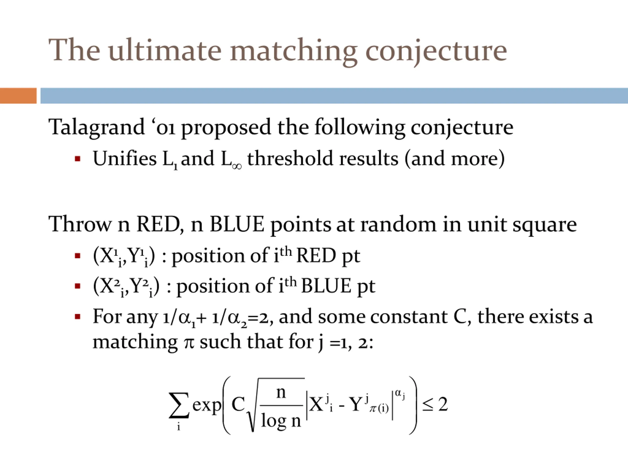 The ultimate matching conjecture Talagrand 01 proposed the following conjecture Unifies L1 and L threshold results (and more) Throw n RED, n BLUE points at random in unit square (X1i,Y1i) : position of ith RED pt (X2i,Y2i) : position of ith BLUE pt For any 1/ 1+ 1/ 2=2, and some constant C, there exists a matching such that for j =1, 2: n j j j exp C X - Y 2 i (i) log n i