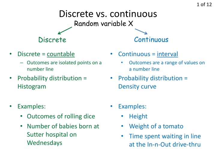 1 of 12 Discrete vs. continuous Random variable X Continuous Discrete Discrete = countable Outcomes are isolated points on a number line Probability distribution = Histogram Continuous = interval Outcomes are a range of values on a number line Probability distribution = Density curve Examples: Outcomes of rolling dice Number of babies born at Sutter hospital on Wednesdays Examples: Height Weight of a tomato Time spent waiting in line at the In-n-Out drive-thru