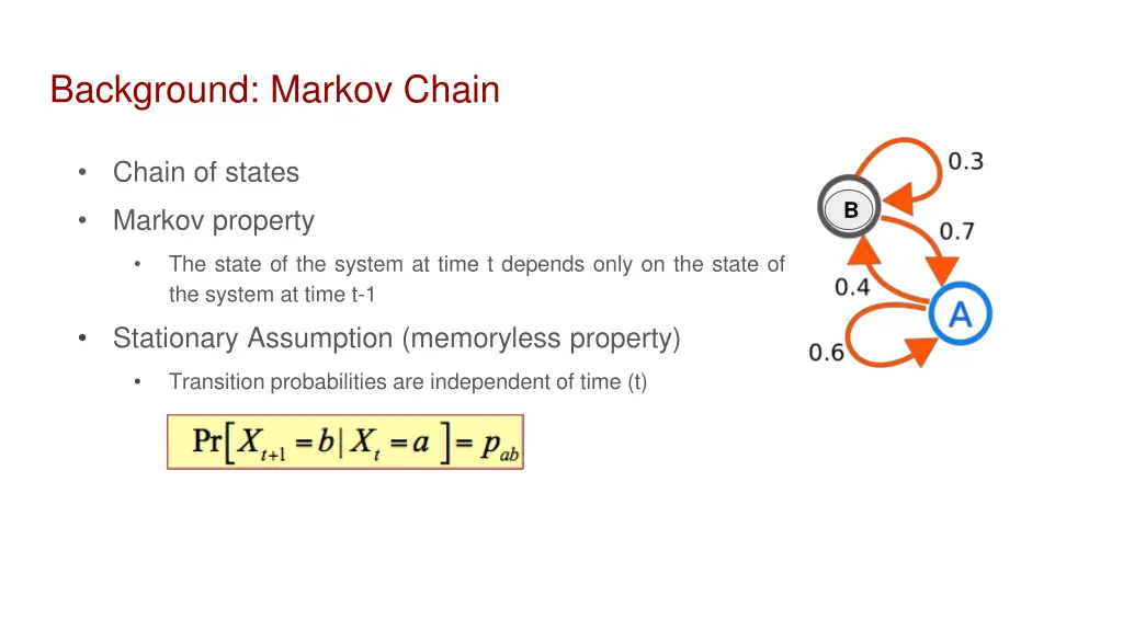 Background: Markov Chain Chain of states B Markov property The state of the system at time t depends only on the state of the system at time t-1 Stationary Assumption (memoryless property) Transition probabilities are independent of time (t)