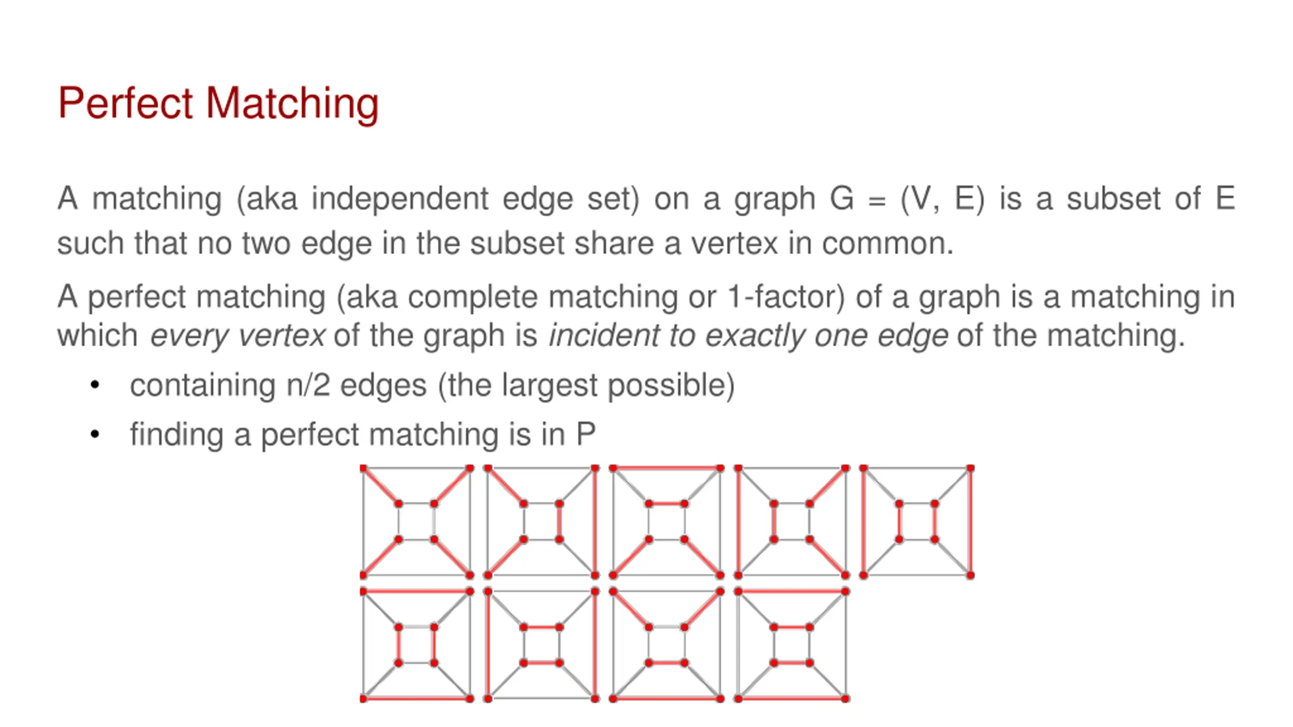 Perfect Matching A matching (aka independent edge set) on a graph G = (V, E) is a subset of E such that no two edge in the subset share a vertex in common. A perfect matching (aka complete matching or 1-factor) of a graph is a matching in which every vertex of the graph is incident to exactly one edge of the matching. containing n/2 edges (the largest possible) finding a perfect matching is in P
