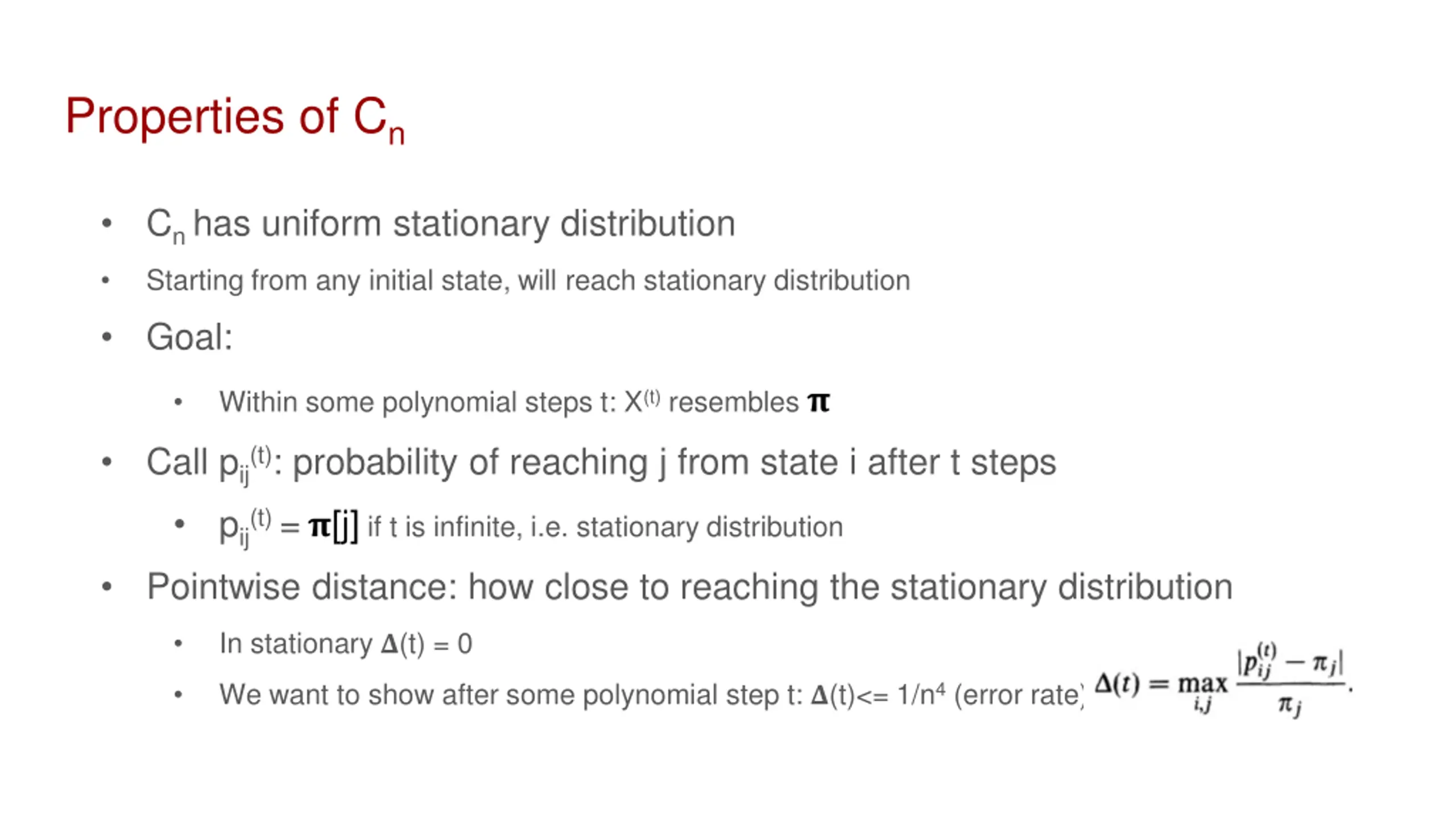Properties of Cn Cnhas uniform stationary distribution Starting from any initial state, will reach stationary distribution Goal: Within some polynomial steps t: X(t)resembles? Call pij(t): probability of reaching j from state i after t steps pij(t)=?[j] if t is infinite, i.e. stationary distribution Pointwise distance: how close to reaching the stationary distribution In stationary ?(t) = 0 We want to show after some polynomial step t: ?(t)<= 1/n4(error rate)