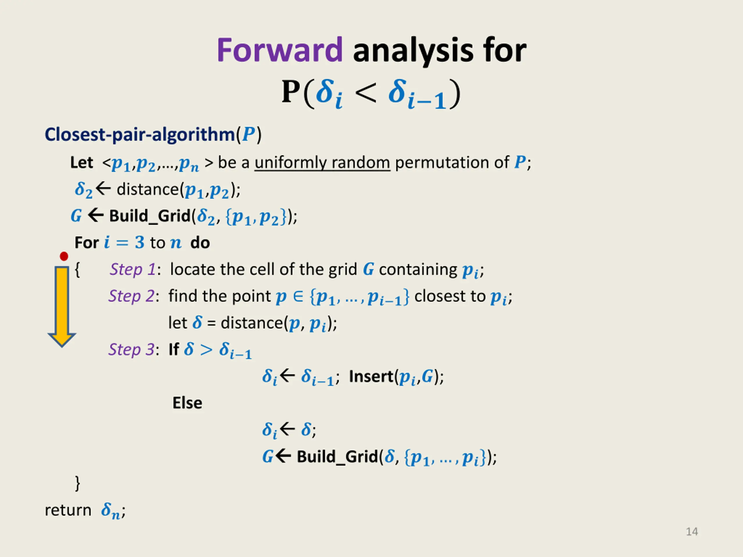 Forward analysis for ?(??< ?? ?) Closest-pair-algorithm(?) Let <??,??, ,?? > be a uniformly random permutation of ?; ?? distance(??,??); ? Build_Grid(??,{??,??}); For? = ? to ? do { Step 1: locate the cell of the grid ? containing ??; Step 2: find the point ? {??, ,?? ?} closest to ??; let ? = distance(?, ??); Step 3: If? > ?? ? ?? ?? ?; Insert(??,?); Else ?? ?; ? Build_Grid(?,{??, ,??}); } return ??; 14