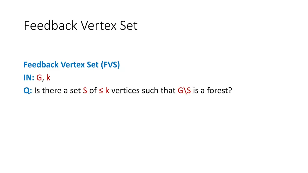 Feedback Vertex Set Feedback Vertex Set (FVS) IN: G, k Q: Is there a set S of k vertices such that G\S is a forest?