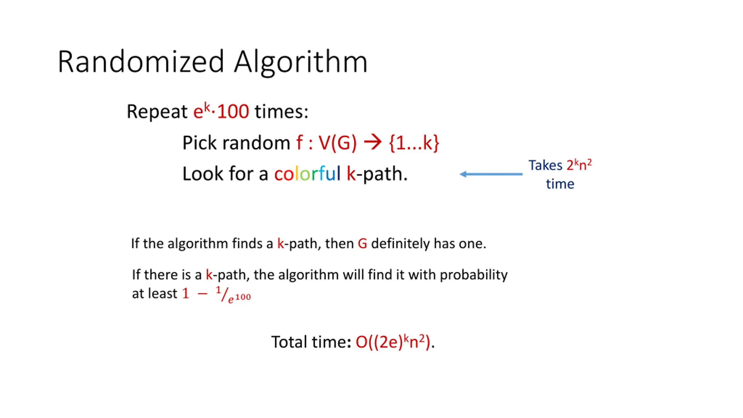 Randomized Algorithm Repeat ek 100 times: Pick random f : V(G) {1...k} Look for a colorful k-path. Takes 2kn2 time If the algorithm finds a k-path, then G definitely has one. If there is a k-path, the algorithm will find it with probability at least 1 ?100 1 Total time: O((2e)kn2).