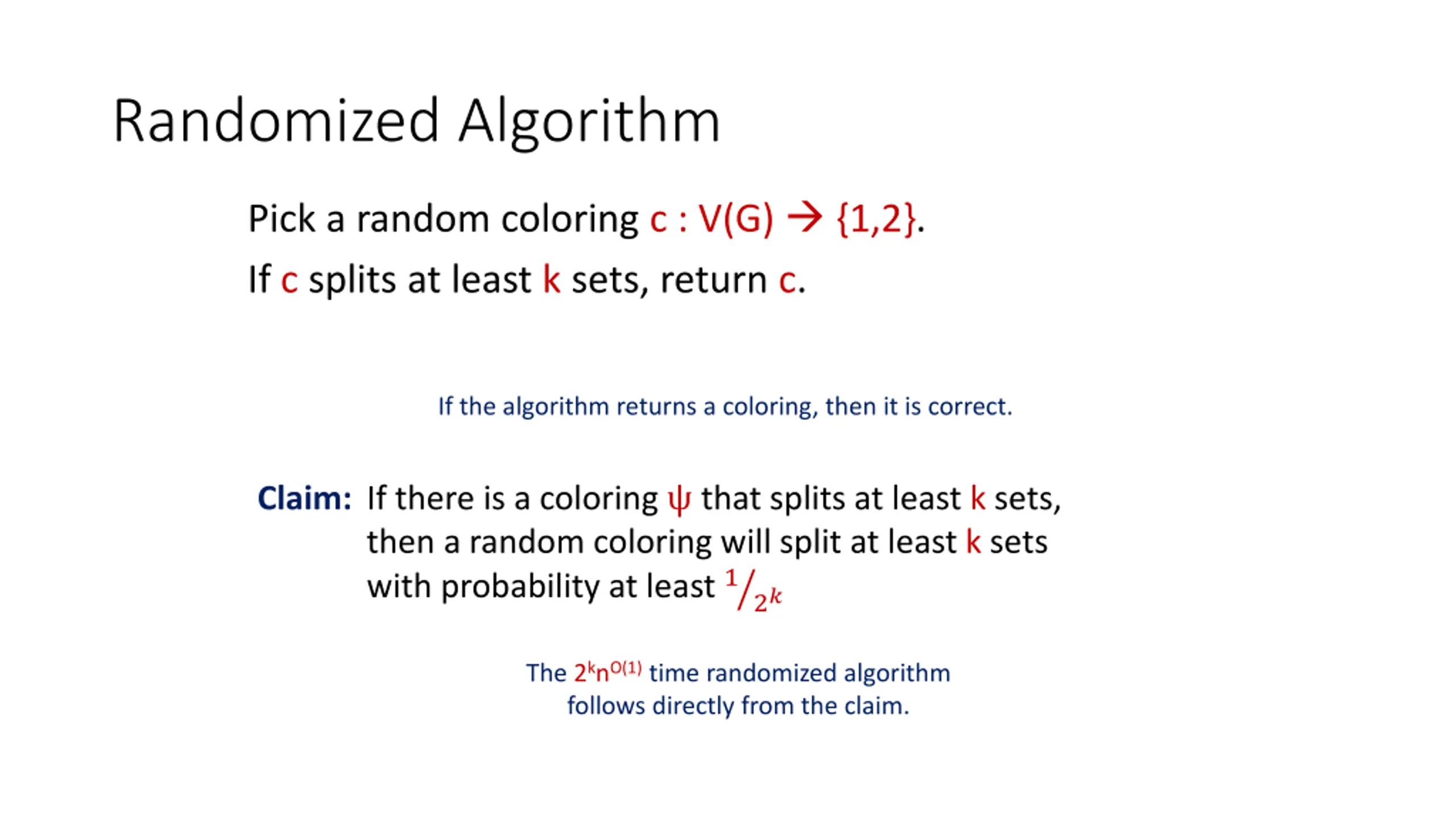 Randomized Algorithm Pick a random coloring c : V(G) {1,2}. If c splits at least k sets, return c. If the algorithm returns a coloring, then it is correct. Claim: If there is a coloring that splits at least k sets, then a random coloring will split at least k sets with probability at least 1 2? The 2knO(1)time randomized algorithm follows directly from the claim.