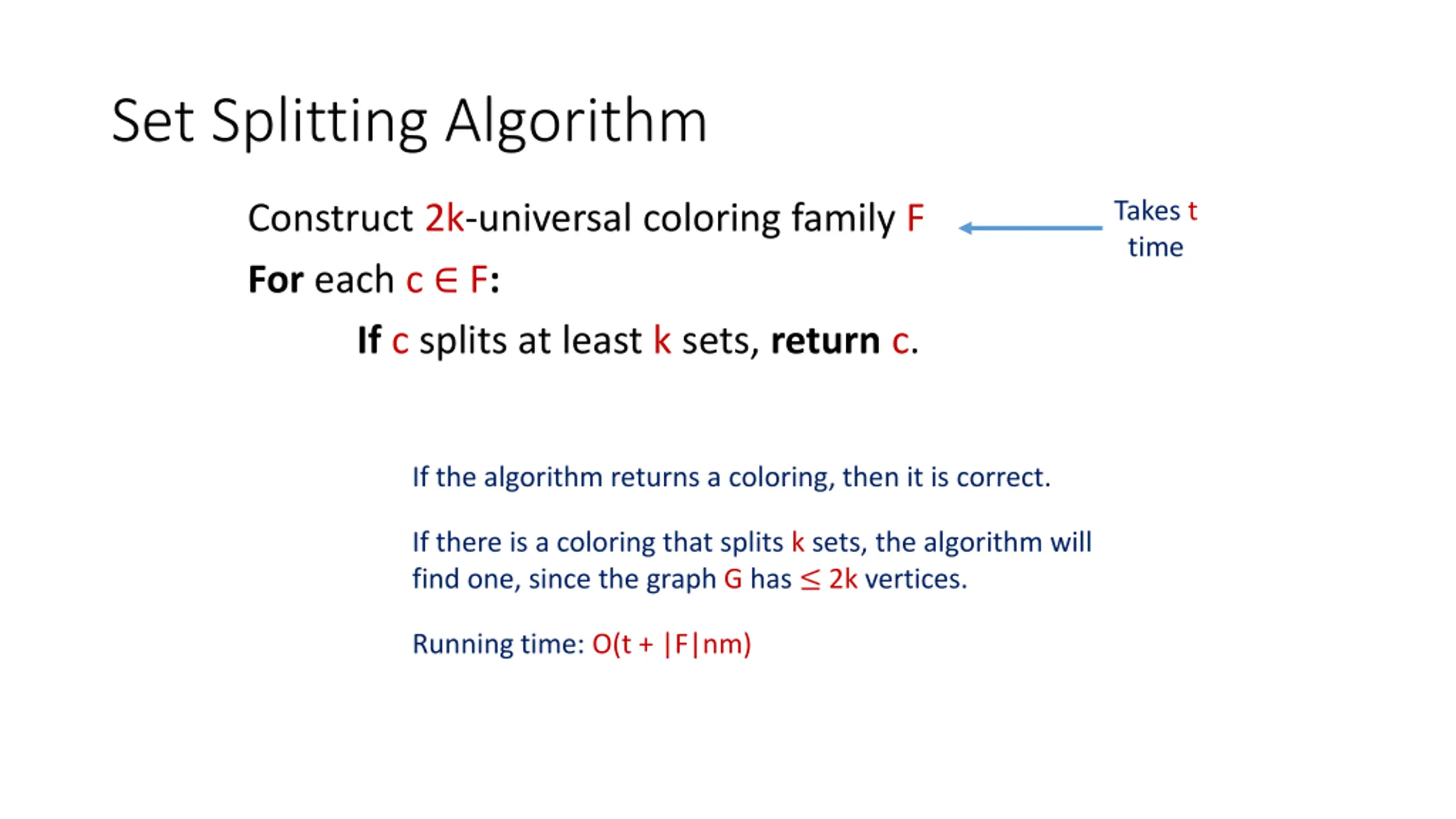 Set Splitting Algorithm Takes t time Construct 2k-universal coloring family F For each c F: If c splits at least k sets, return c. If the algorithm returns a coloring, then it is correct. If there is a coloring that splits k sets, the algorithm will find one, since the graph G has 2k vertices. Running time: O(t + |F|nm)