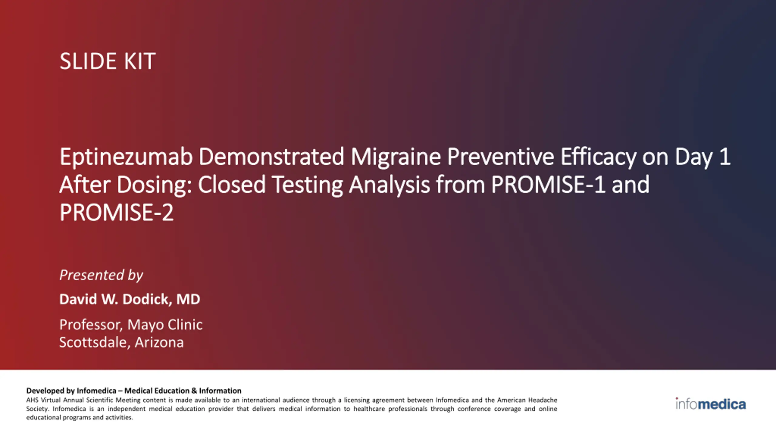 - SLIDE KIT Eptinezumab EptinezumabDemonstrated Migraine Preventive Efficacy on Day 1 Demonstrated Migraine Preventive Efficacy on Day 1 After After Dosing: Closed Testing Analysis from PROMISE Dosing: Closed Testing Analysis from PROMISE- -1 and PROMISE PROMISE- -2 2 1 and Presented by David W. Dodick, MD Professor, Mayo Clinic Scottsdale, Arizona Developed by Infomedica Medical Education& Information AHS Virtual Annual Scientific Meeting content is made available to an international audience through a licensing agreement between Infomedica and the American Headache Society. Infomedica is an independent medical education provider that delivers medical information to healthcare professionals through conference coverage and online educational programs and activities.