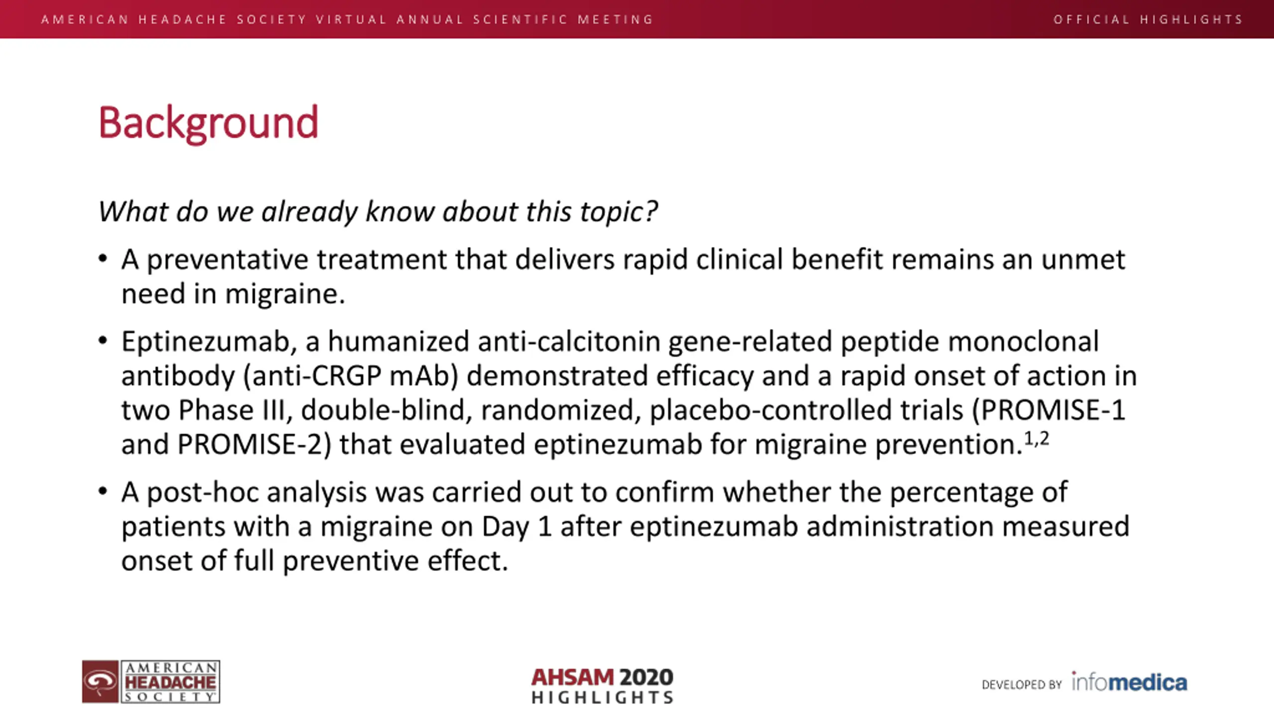 - A M E R I C A N H E A D A C H E S O C I E T Y V I R T U A L A N N U A L S C I E N T I F I C M E E T I N G O F F I C I A L H I G H L I G H T S Background Background What do we already know about this topic? A preventative treatment that delivers rapid clinical benefit remains an unmet need in migraine. Eptinezumab, a humanized anti-calcitonin gene-related peptide monoclonal antibody (anti-CRGP mAb) demonstrated efficacy and a rapid onset of action in two Phase III, double-blind, randomized, placebo-controlled trials (PROMISE-1 and PROMISE-2) that evaluated eptinezumab for migraine prevention.1,2 A post-hoc analysis was carried out to confirm whether the percentage of patients with a migraine on Day 1 after eptinezumab administration measured onset of full preventive effect. DEVELOPED BY