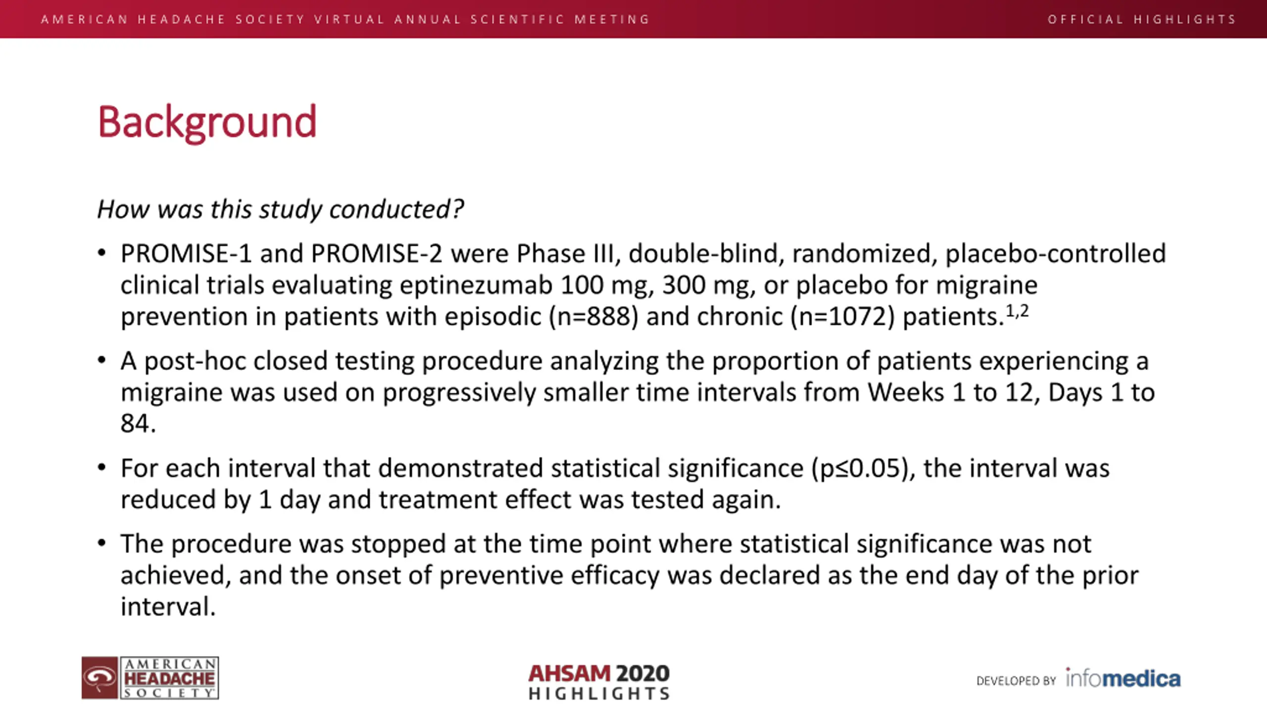 - A M E R I C A N H E A D A C H E S O C I E T Y V I R T U A L A N N U A L S C I E N T I F I C M E E T I N G O F F I C I A L H I G H L I G H T S Background Background How was this study conducted? PROMISE-1 and PROMISE-2 were Phase III, double-blind, randomized, placebo-controlled clinical trials evaluating eptinezumab 100 mg, 300 mg, or placebo for migraine prevention in patients with episodic (n=888) and chronic (n=1072) patients.1,2 A post-hoc closed testing procedure analyzing the proportion of patients experiencing a migraine was used on progressively smaller time intervals from Weeks 1 to 12, Days 1 to 84. For each interval that demonstrated statistical significance (p 0.05), the interval was reduced by 1 day and treatment effect was tested again. The procedure was stopped at the time point where statistical significance was not achieved, and the onset of preventive efficacy was declared as the end day of the prior interval. DEVELOPED BY