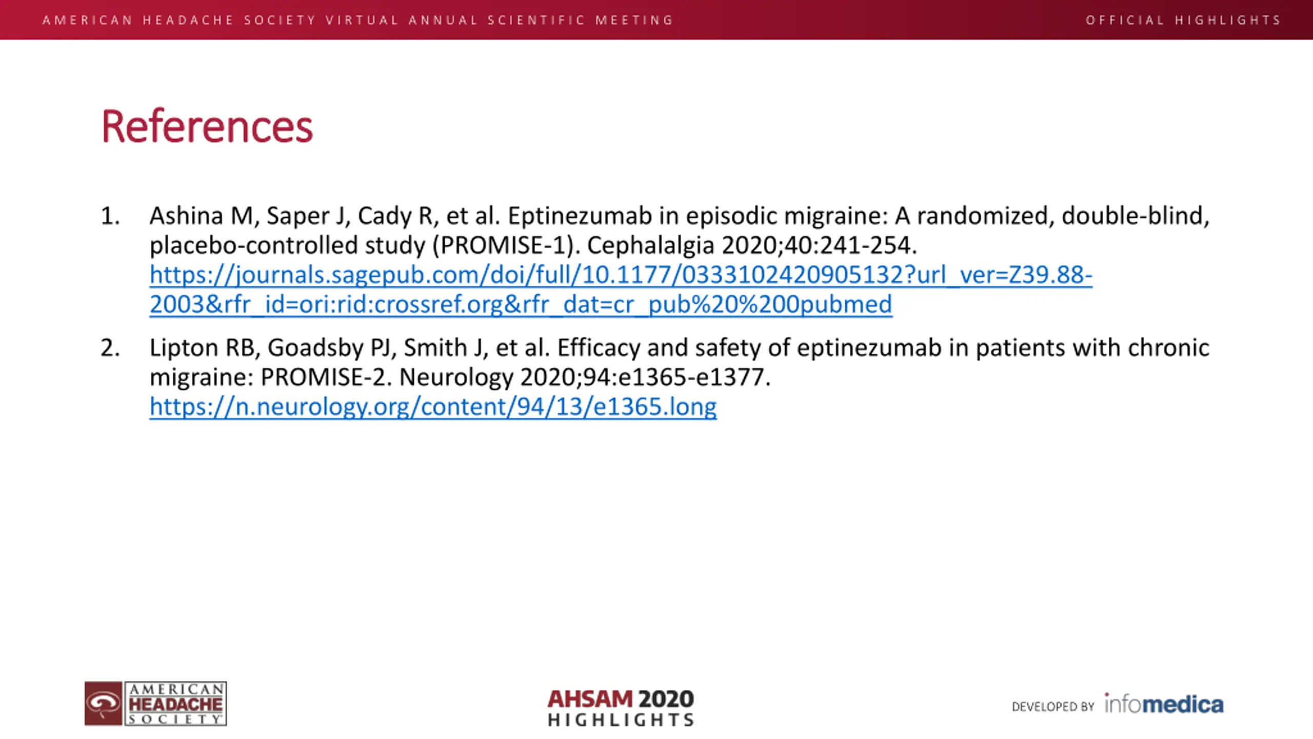 - A M E R I C A N H E A D A C H E S O C I E T Y V I R T U A L A N N U A L S C I E N T I F I C M E E T I N G O F F I C I A L H I G H L I G H T S References References 1. Ashina M, Saper J, Cady R, et al. Eptinezumab in episodic migraine: A randomized, double-blind, placebo-controlled study (PROMISE-1). Cephalalgia 2020;40:241-254. https://journals.sagepub.com/doi/full/10.1177/0333102420905132?url_ver=Z39.88- 2003&rfr_id=ori:rid:crossref.org&rfr_dat=cr_pub%20%200pubmed 2. Lipton RB, Goadsby PJ, Smith J, et al. Efficacy and safety of eptinezumab in patients with chronic migraine: PROMISE-2. Neurology 2020;94:e1365-e1377. https://n.neurology.org/content/94/13/e1365.long DEVELOPED BY