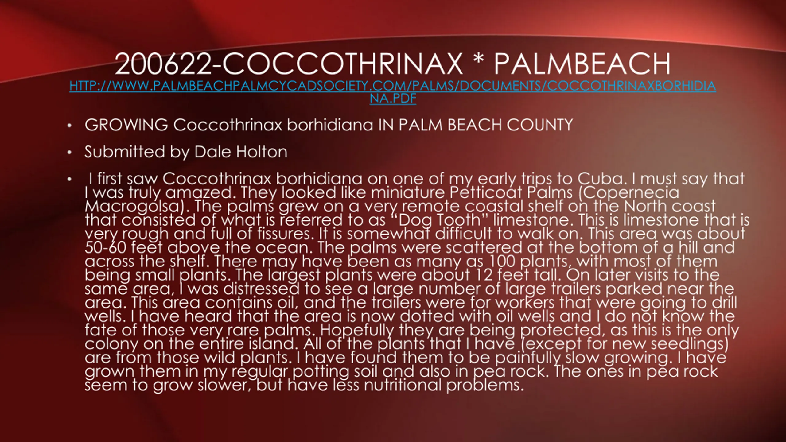 200622Coccothrinax PalmSpGroup http://www.virtualherbarium.org/psg/flagship/coccothrinax_borhidiana.html Threats to Survival Fire, road construction and nearby oil extraction are the greatest threats to survival of Coccothrinax borhidiana. The very small population size adds to the level of threat to this palm, which is found nowhere else along the northern coast west of Matanzas Bay, even in the same ecosystem. Current Conservation Measures Although the place, Punta Guanos, has had official conservation status in the province since 1984. The Matanzas Botanic Garden staff is taking effective actions for conserving both the natural population and ex situ cultivation of this remarkable species. On behalf of C. borhidiana, the Matanzas Botanic Garden is providing information on the importance and risks for the species, as well as environmental education of children and youth in schools.
