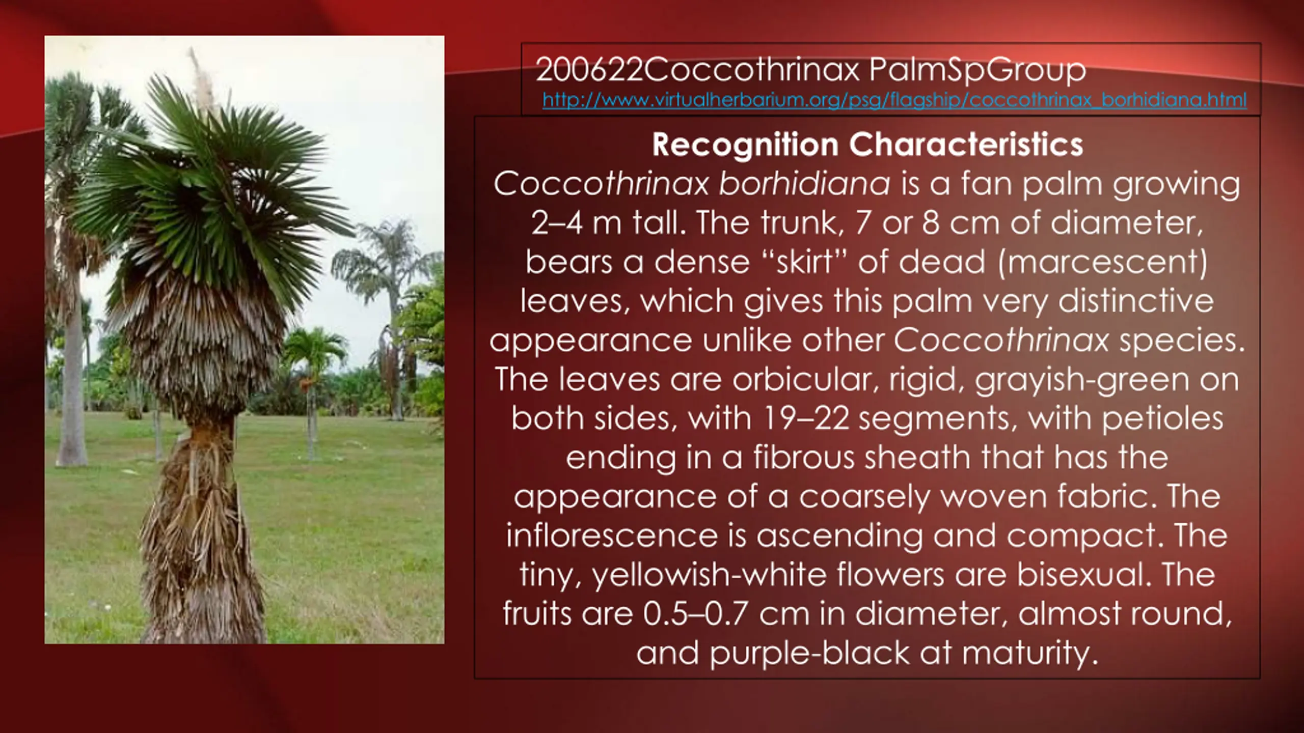 200622Coccothrinax PalmSpGroup http://www.virtualherbarium.org/psg/flagship/coccothrinax_borhidiana.html Recognition Characteristics Coccothrinax borhidiana is a fan palm growing 2 4 m tall. The trunk, 7 or 8 cm of diameter, bears a dense skirt of dead (marcescent) leaves, which gives this palm very distinctive appearance unlike other Coccothrinax species. The leaves are orbicular, rigid, grayish-green on both sides, with 19 22 segments, with petioles ending in a fibrous sheath that has the appearance of a coarsely woven fabric. The inflorescence is ascending and compact. The tiny, yellowish-white flowers are bisexual. The fruits are 0.5 0.7 cm in diameter, almost round, and purple-black at maturity.