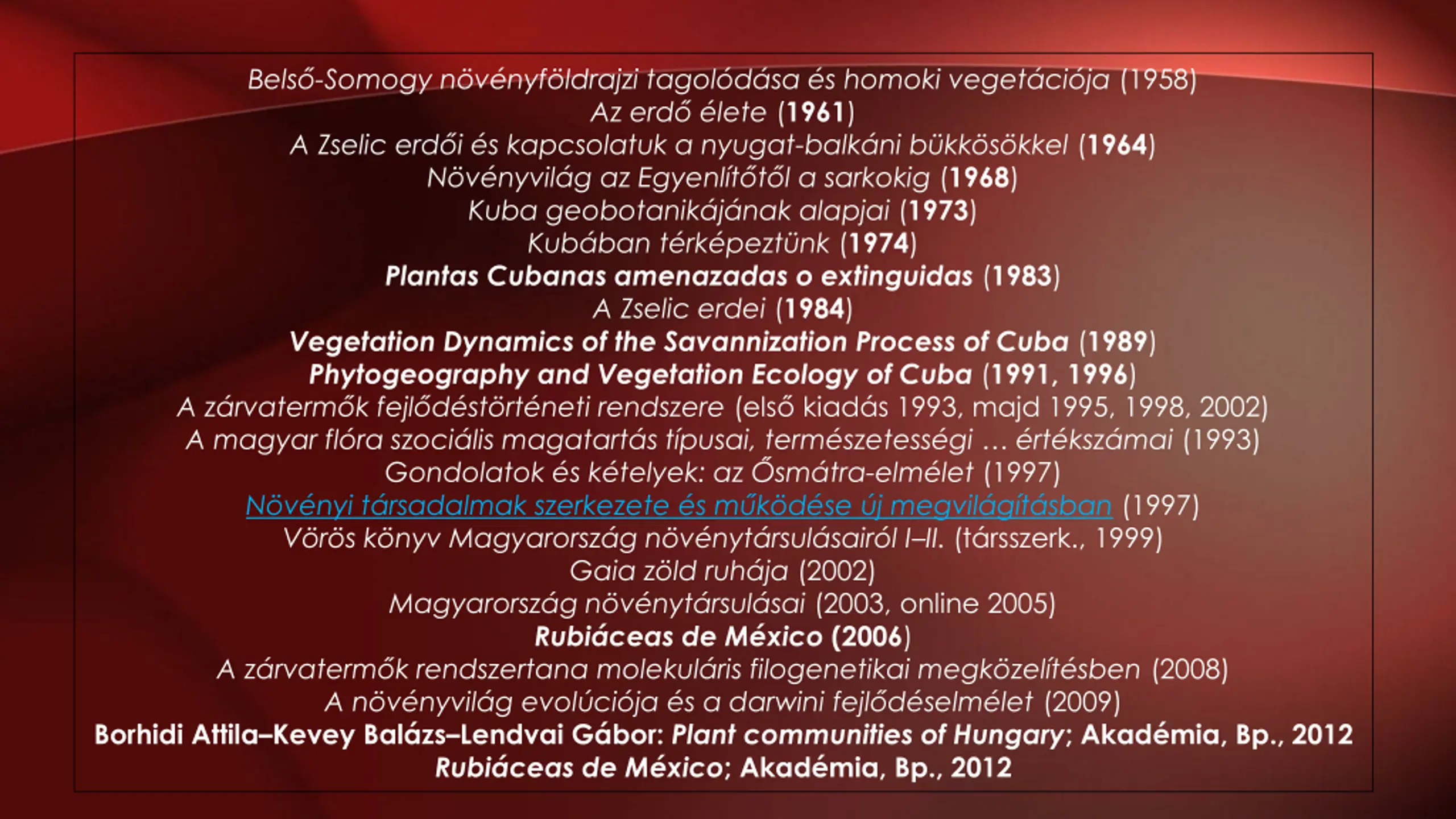 Bels-Somogy nvnyfldrajzi tagoldsa s homoki vegetcija (1958) Az erd lete (1961) A Zselic erd i s kapcsolatuk a nyugat-balk ni b kk s kkel (1964) N v nyvil g az Egyenl t t l a sarkokig (1968) Kuba geobotanik j nak alapjai (1973) Kub ban t rk pezt nk (1974) Plantas Cubanas amenazadas o extinguidas (1983) A Zselic erdei (1984) Vegetation Dynamics of the Savannization Process of Cuba (1989) Phytogeography and Vegetation Ecology of Cuba (1991, 1996) A z rvaterm k fejl d st rt neti rendszere (els kiad s 1993, majd 1995, 1998, 2002) A magyar fl ra szoci lis magatart s t pusai, term szetess gi rt ksz mai (1993) Gondolatok s k telyek: az sm tra-elm let (1997) N v nyi t rsadalmak szerkezete s m k d se j megvil g t sban (1997) V r s k nyv Magyarorsz g n v nyt rsul sair l I II. (t rsszerk., 1999) Gaia z ld ruh ja (2002) Magyarorsz g n v nyt rsul sai (2003, online 2005) Rubi ceas de M xico (2006) A z rvaterm k rendszertana molekul ris filogenetikai megk zel t sben (2008) A n v nyvil g evol ci ja s a darwini fejl d selm let (2009) Borhidi Attila Kevey Bal zs Lendvai G bor: Plant communities of Hungary; Akad mia, Bp., 2012 Rubi ceas de M xico; Akad mia, Bp., 2012