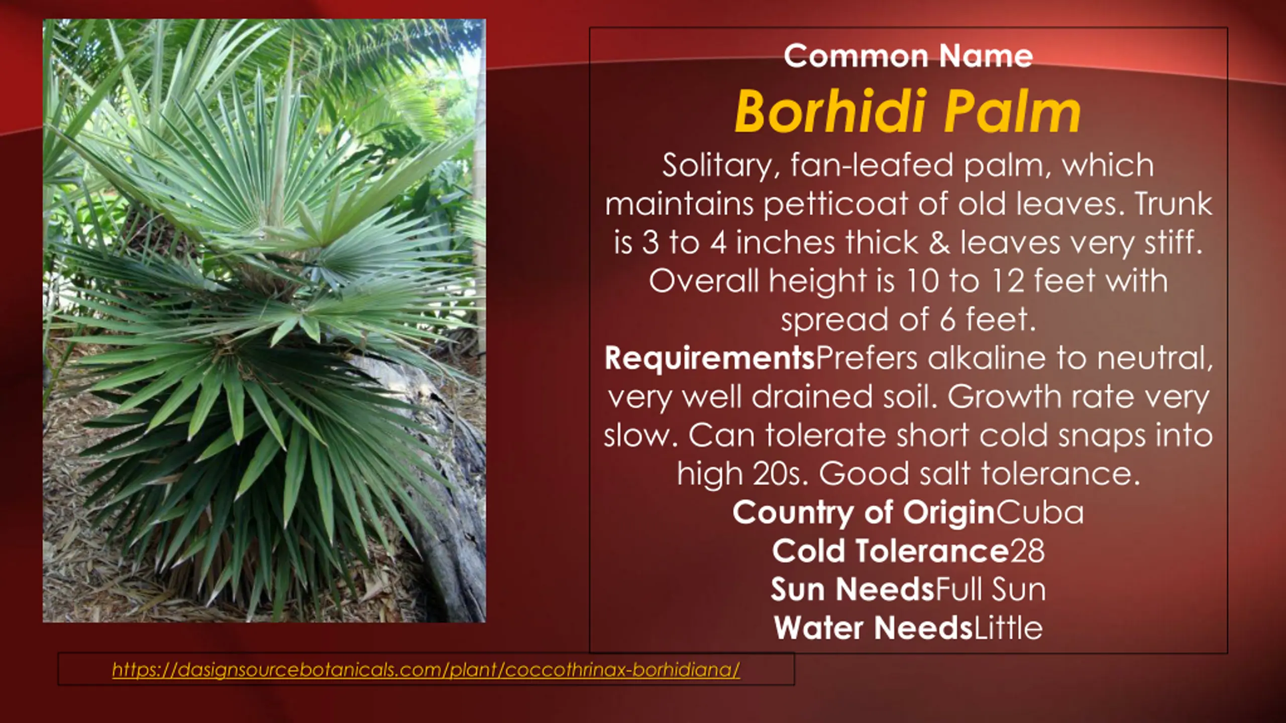 Common Name Borhidi Palm Solitary, fan-leafed palm, which maintains petticoat of old leaves. Trunk is 3 to 4 inches thick & leaves very stiff. Overall height is 10 to 12 feet with spread of 6 feet. RequirementsPrefers alkaline to neutral, very well drained soil. Growth rate very slow. Can tolerate short cold snaps into high 20s. Good salt tolerance. Country of OriginCuba Cold Tolerance28 Sun NeedsFull Sun Water NeedsLittle https://dasignsourcebotanicals.com/plant/coccothrinax-borhidiana/
