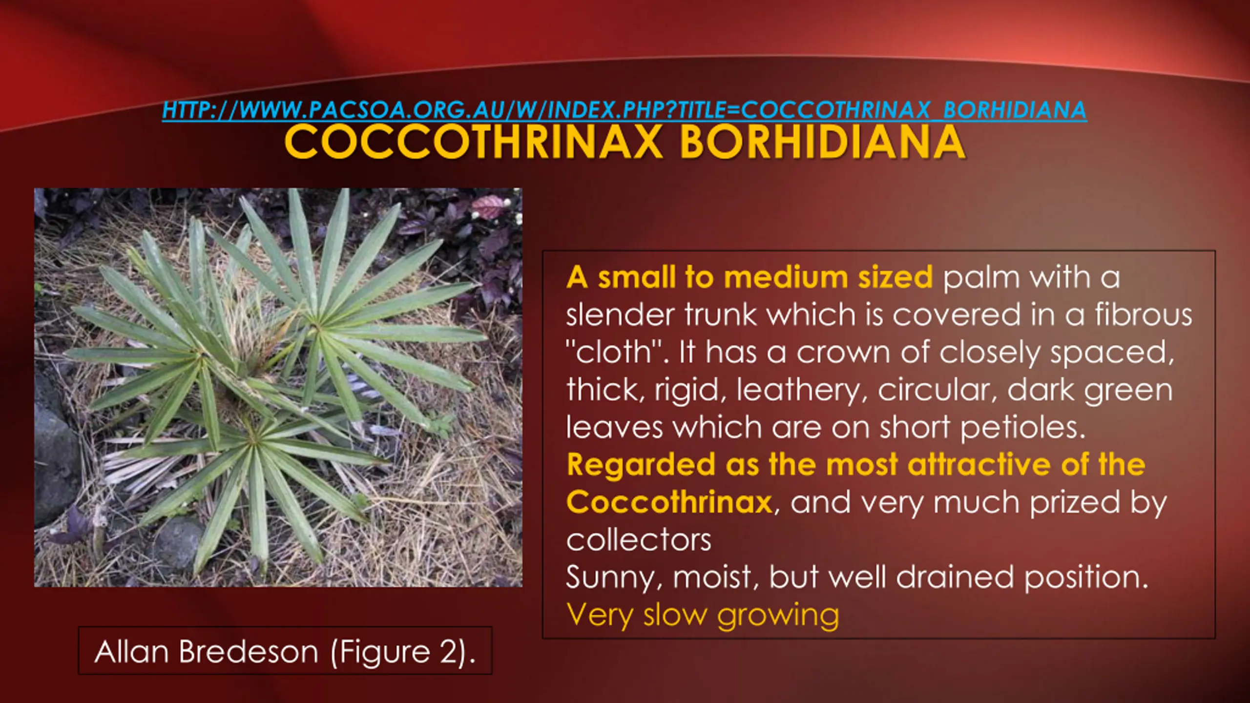 HTTP://WWW.PACSOA.ORG.AU/W/INDEX.PHP?TITLE=COCCOTHRINAX_BORHIDIANA COCCOTHRINAX BORHIDIANA A small to medium sized palm with a slender trunk which is covered in a fibrous "cloth". It has a crown of closely spaced, thick, rigid, leathery, circular, dark green leaves which are on short petioles. Regarded as the most attractive of the Coccothrinax, and very much prized by collectors Sunny, moist, but well drained position. Very slow growing Allan Bredeson (Figure 2).