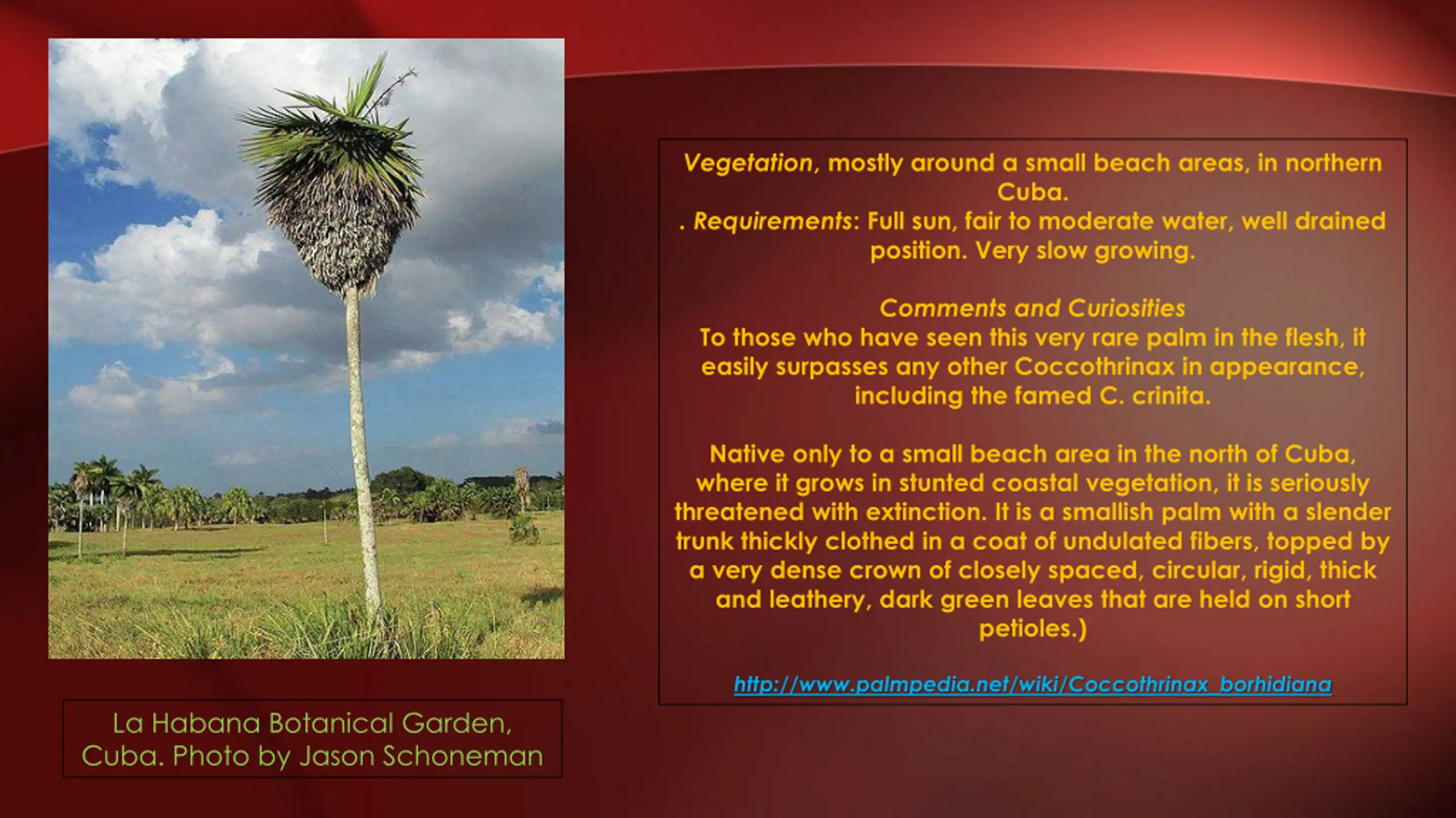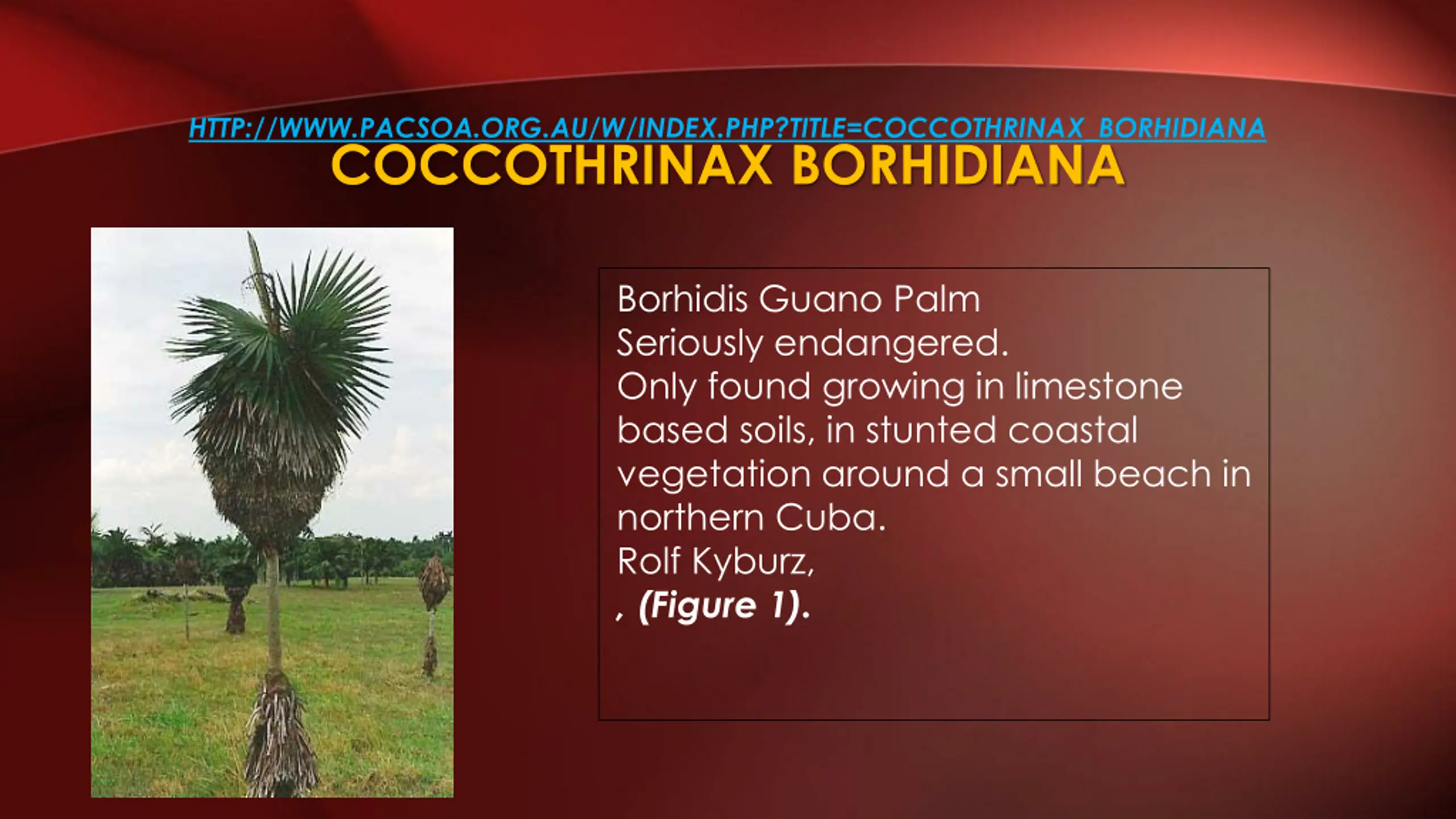 HTTP://WWW.PACSOA.ORG.AU/W/INDEX.PHP?TITLE=COCCOTHRINAX_BORHIDIANA COCCOTHRINAX BORHIDIANA Borhidis Guano Palm Seriously endangered. Only found growing in limestone based soils, in stunted coastal vegetation around a small beach in northern Cuba. Rolf Kyburz, , (Figure 1).