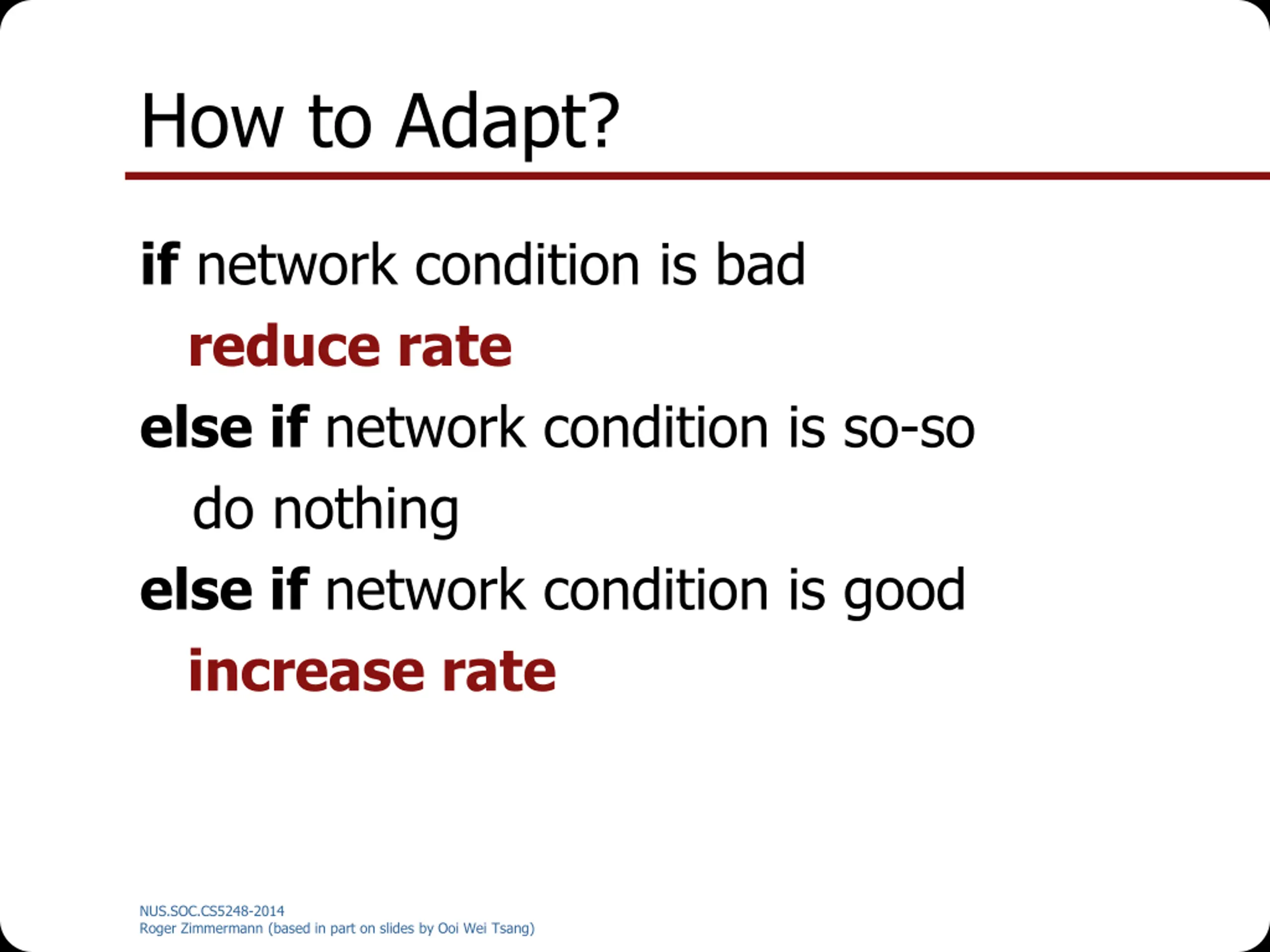 How to Adapt? if network condition is bad reduce rate else if network condition is so-so do nothing else if network condition is good increase rate NUS.SOC.CS5248-2014 Roger Zimmermann (based in part on slides by Ooi Wei Tsang)