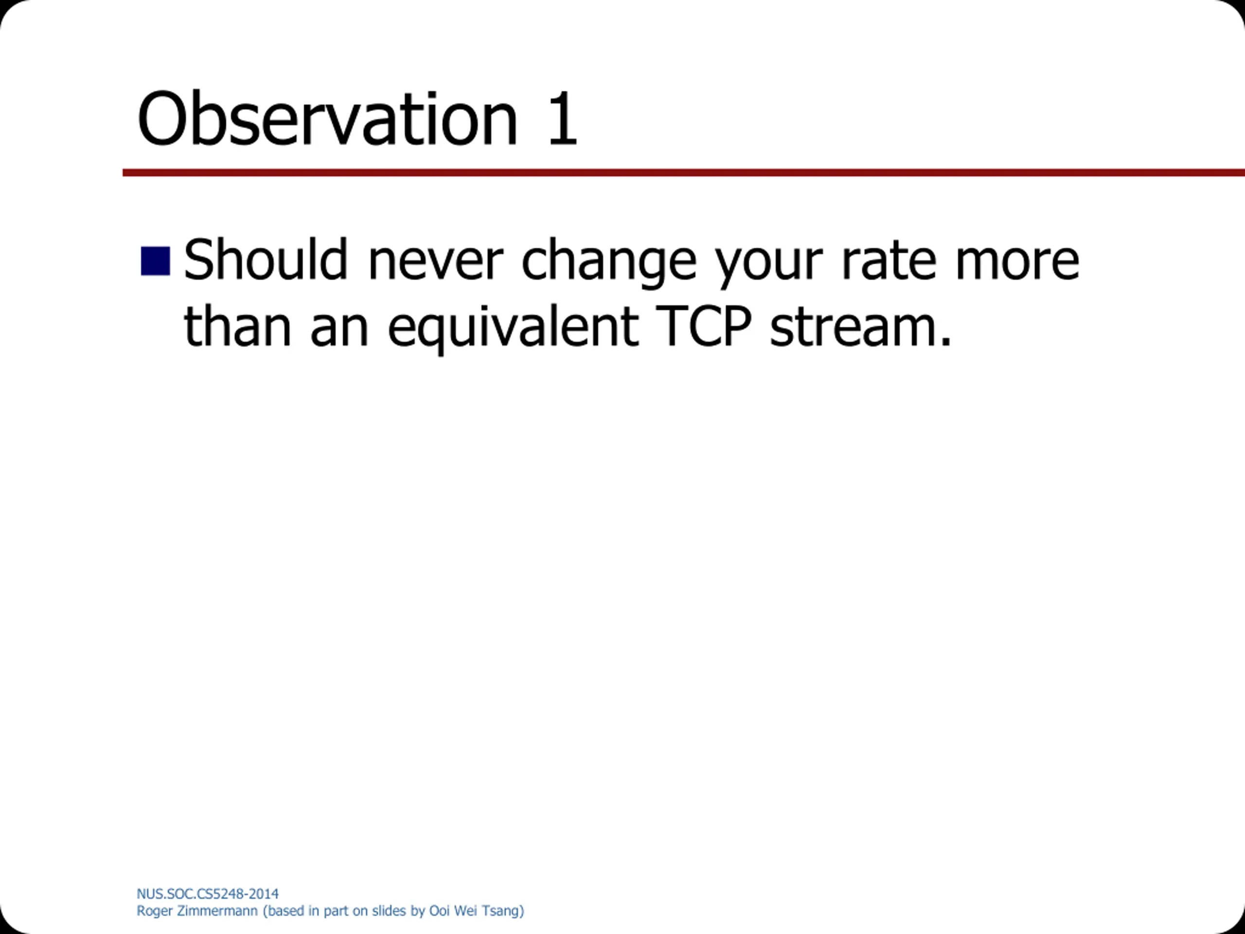 Observation 1 Should never change your rate more than an equivalent TCP stream. NUS.SOC.CS5248-2014 Roger Zimmermann (based in part on slides by Ooi Wei Tsang)