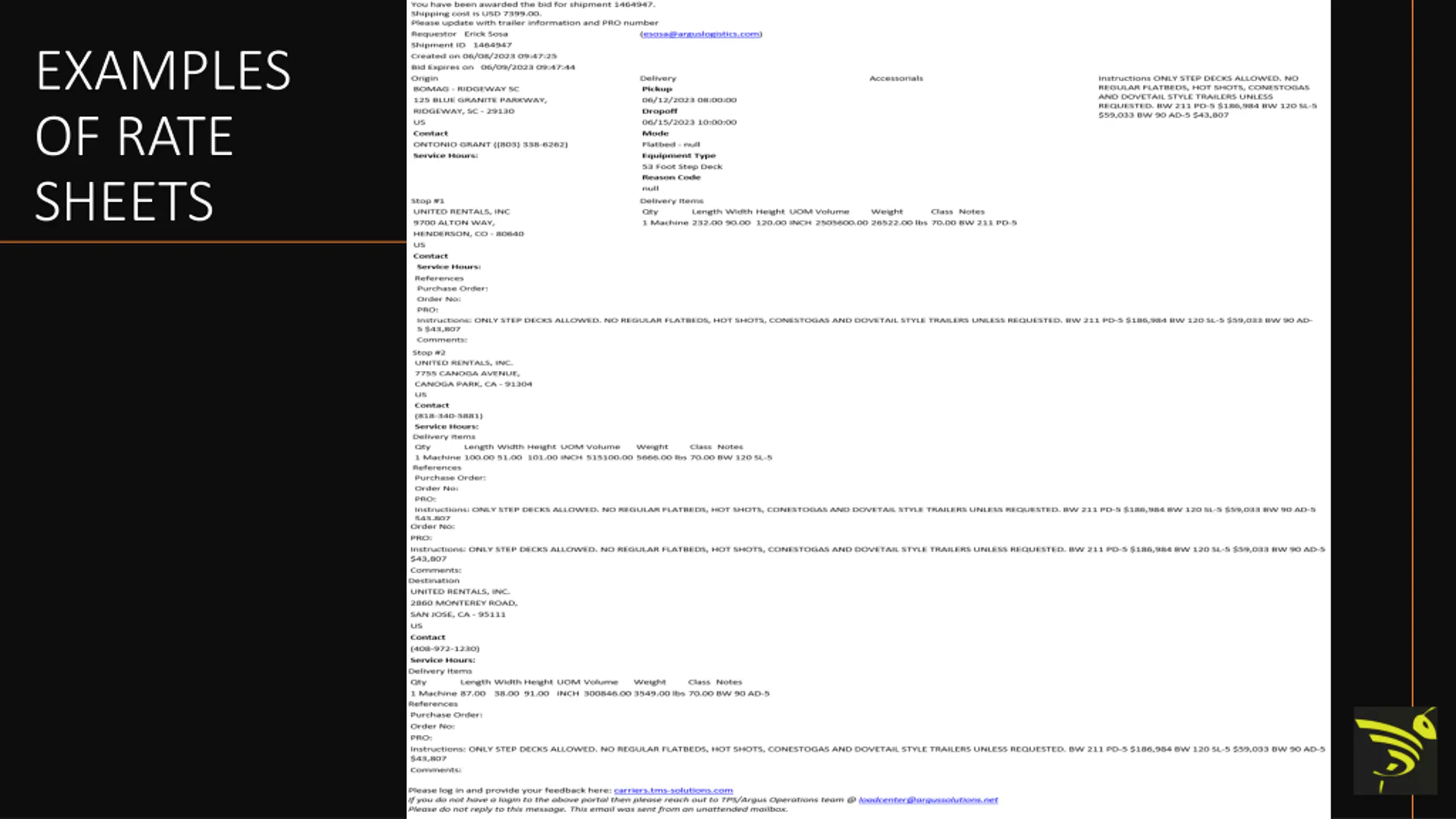 RATE SHEETS IF IT S NOT IN WRITING, IT DOES NOT EXIST All customer rate sheets should be sent to: ratesheets@beemac.com with the order number (pro number) in the subject line. This should be done at time of entering the order. Rate sheets include any customer rates that are agreed upon between you and your customer. These include but are not limited to: Spot Quotes. Approved Quotes to customers via email. Accessorial approvals from the customer. Acceptable rates sheets are: Actual tender sheet with rate on it. Screenshot from customer or terms with rate on it. Approval response from customer.