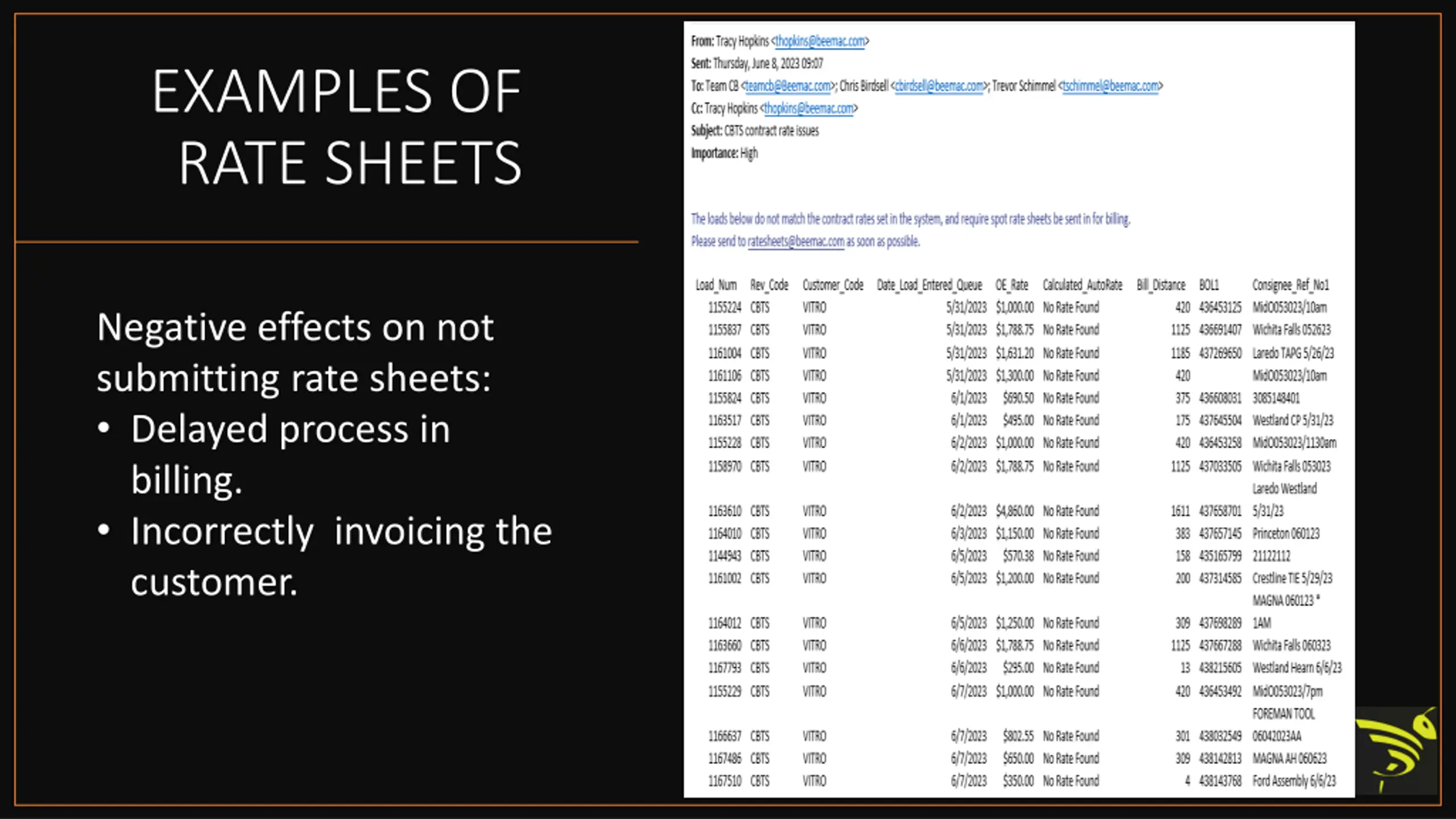 EXAMPLES OF RATE SHEETS Negative effects on not submitting rate sheets: Delayed process in billing. Incorrectly invoicing the customer.