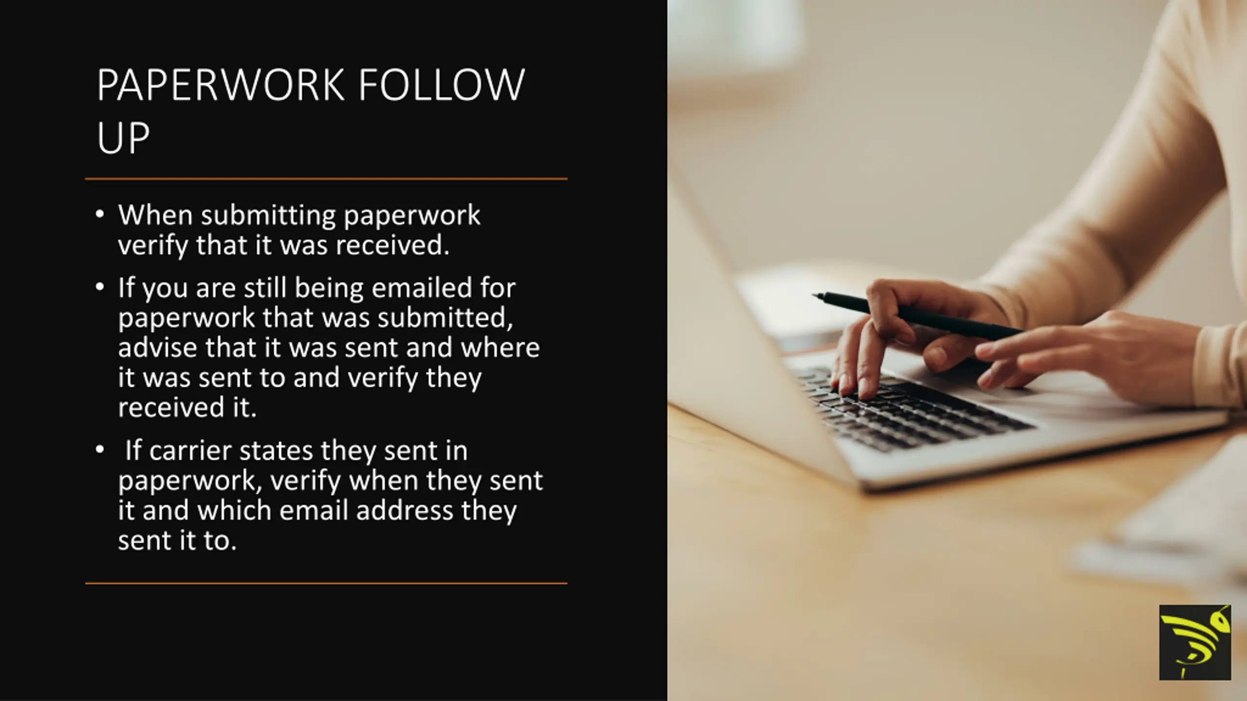 PAPERWORK FOLLOW UP When submitting paperwork verify that it was received. If you are still being emailed for paperwork that was submitted, advise that it was sent and where it was sent to and verify they received it. If carrier states they sent in paperwork, verify when they sent it and which email address they sent it to.